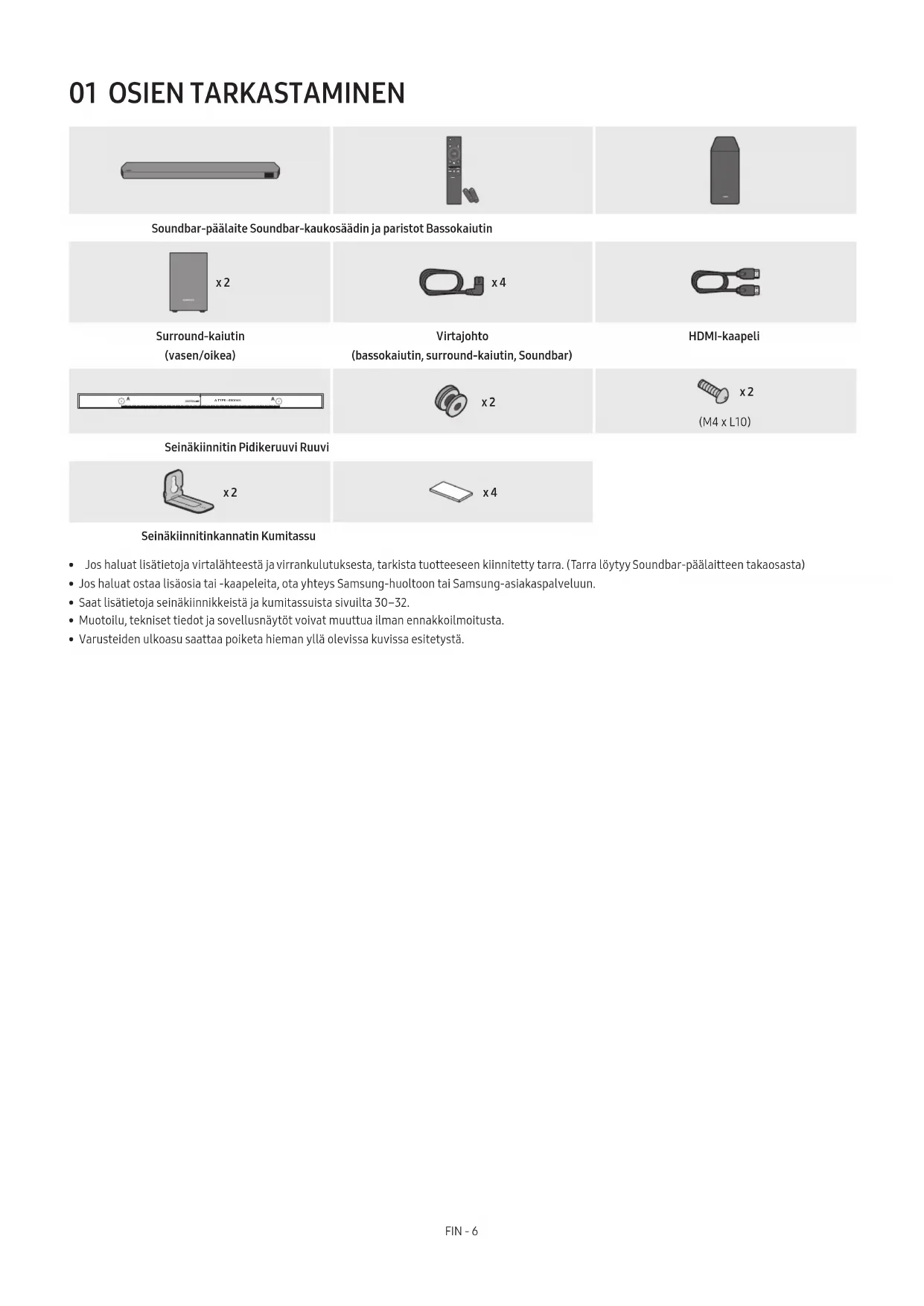 - kemikaaleja. Älä hävitä paristoa tavallisen kotitalousjätteen mukana. Älä altista paristoa kuumuudelle, suoralle auringonvalolle tai tulelle. Älä aiheuta oikosulkua tai ylikuumenemista paristoon tai pura sitä. HUOMIO: Jos paristo vaihdetaan väärin, on olemassa räjähdyksen vaara. Vaihda paristo vain samanlaiseen tai vastaavan tyyppiseen paristoon.FIN - 4 SISÄLTÖ 01 Osien tarkastaminen 6 02 Tuotteen yleiskatsaus 7 Soundbarin yläpaneeli p. 7