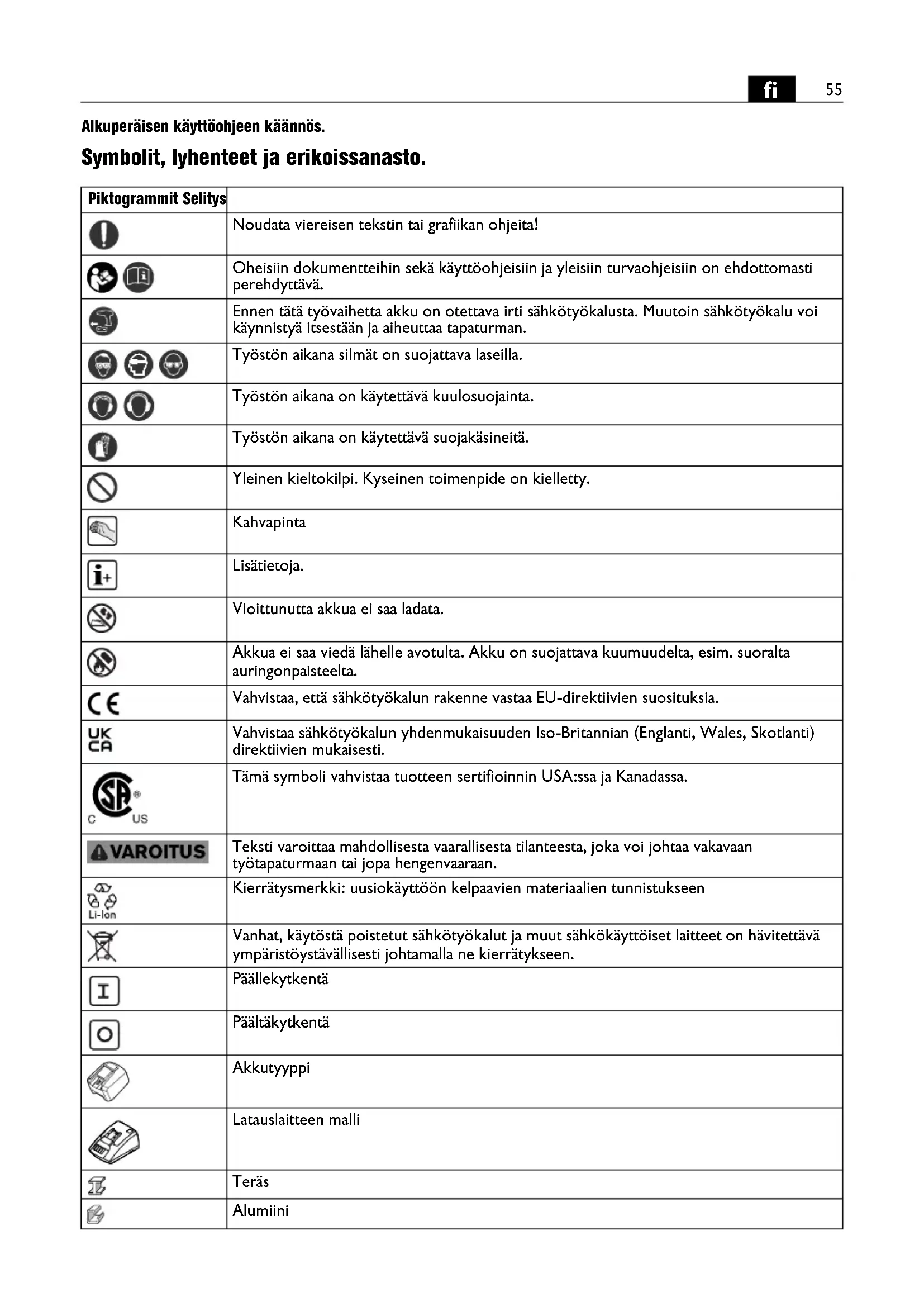 Alkuperäisen käyttöohjeen käännös. Symbolit, lyhenteet ja erikoissanasto. Piktogrammit Selitys Noudata viereisen tekstin tai grafiikan ohjeita! Oheisiin dokumentteihin sekä käyttöohjeisiin ja yleisiin turvaohjeisiin on ehdottomasti perehdyttävä. Ennen tätä työvaihetta akku on otettava irti sähkötyökalusta. Muutoin sähkötyökalu voi käynnistyä itsestään ja aiheuttaa tapaturman. Työstön aikana silmät on suojattava laseilla. Työstön aikana on käytettävä kuulosuojainta. Työstön aikana on käytettävä suojakäsineitä. Yleinen kieltokilpi. Kyseinen toimenpide on kielletty. Kahvapinta Lisätietoja. Vioittunutta akkua ei saa ladata. Akkua ei saa viedä lähelle avotulta. Akku on suojattava kuumuudelta, esim. suoralta auringonpaisteelta. Vahvistaa, että sähkötyökalun rakenne vastaa EU-direktiivien suosituksia. Vahvistaa sähkötyökalun yhdenmukaisuuden Iso-Britannian (Englanti, Wales, Skotlanti) direktiivien mukaisesti. Tämä symboli vahvistaa tuotteen sertifioinnin USA:ssa ja Kanadassa. Teksti varoittaa mahdollisesta vaarallisesta tilanteesta, joka voi johtaa vakavaan työtapaturmaan tai jopa hengenvaaraan. Kierrätysmerkki: uusiokäyttöön kelpaavien materiaalien tunnistukseen Vanhat, käytöstä poistetut sähkötyökalut ja muut sähkökäyttöiset laitteet on hävitettävä ympäristöystävällisesti johtamalla ne kierrätykseen. Päällekytkentä Päältäkytkentä Akkutyyppi Latauslaitteen malli Teräs Alumiini56