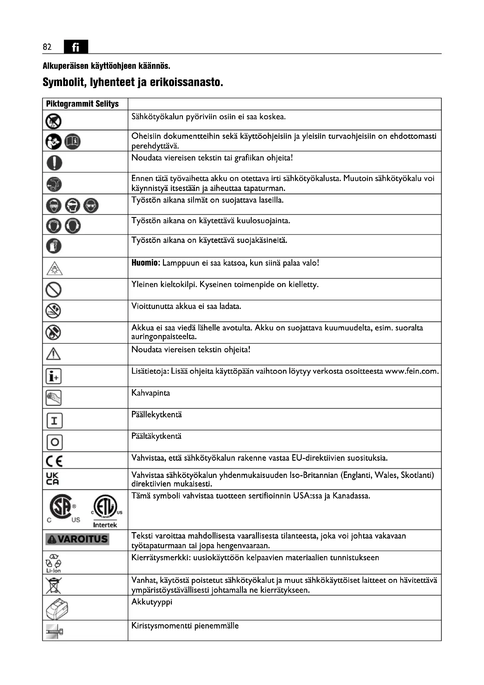 Alkuperäisen käyttöohjeen käännös. Symbolit, lyhenteet ja erikoissanasto. Piktogrammit Selitys Sähkötyökalun pyöriviin osiin ei saa koskea. Oheisiin dokumentteihin sekä käyttöohjeisiin ja yleisiin turvaohjeisiin on ehdottomasti perehdyttävä. Noudata viereisen tekstin tai grafiikan ohjeita! Ennen tätä työvaihetta akku on otettava irti sähkötyökalusta. Muutoin sähkötyökalu voi käynnistyä itsestään ja aiheuttaa tapaturman. Työstön aikana silmät on suojattava laseilla. Työstön aikana on käytettävä kuulosuojainta. Työstön aikana on käytettävä suojakäsineitä. Huomio: Lamppuun ei saa katsoa, kun siinä palaa valo! Yleinen kieltokilpi. Kyseinen toimenpide on kielletty. Vioittunutta akkua ei saa ladata. Akkua ei saa viedä lähelle avotulta. Akku on suojattava kuumuudelta, esim. suoralta auringonpaisteelta. Noudata viereisen tekstin ohjeita! Lisätietoja: Lisää ohjeita käyttöpään vaihtoon löytyy verkosta osoitteesta www.fein.com. Kahvapinta Päällekytkentä Päältäkytkentä Vahvistaa, että sähkötyökalun rakenne vastaa EU-direktiivien suosituksia. Vahvistaa sähkötyökalun yhdenmukaisuuden Iso-Britannian (Englanti, Wales, Skotlanti) direktiivien mukaisesti. Tämä symboli vahvistaa tuotteen sertifioinnin USA:ssa ja Kanadassa. Teksti varoittaa mahdollisesta vaarallisesta tilanteesta, joka voi johtaa vakavaan työtapaturmaan tai jopa hengenvaaraan. Kierrätysmerkki: uusiokäyttöön kelpaavien materiaalien tunnistukseen Vanhat, käytöstä poistetut sähkötyökalut ja muut sähkökäyttöiset laitteet on hävitettävä ympäristöystävällisesti johtamalla ne kierrätykseen. Akkutyyppi Kiristysmomentti pienemmälle83