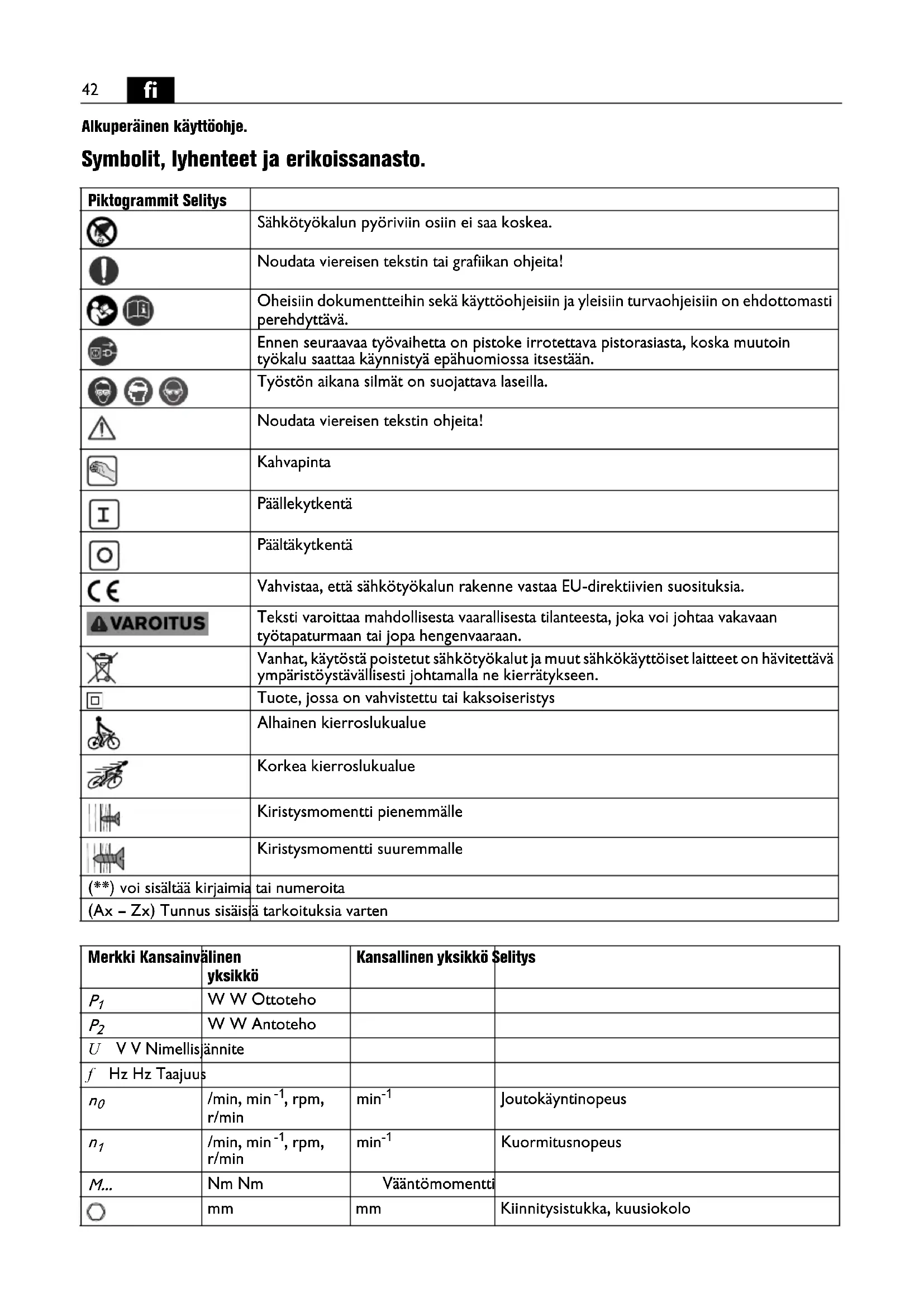 Alkuperäinen käyttöohje. Symbolit, lyhenteet ja erikoissanasto. Piktogrammit Selitys Sähkötyökalun pyöriviin osiin ei saa koskea. Noudata viereisen tekstin tai grafiikan ohjeita! Oheisiin dokumentteihin sekä käyttöohjeisiin ja yleisiin turvaohjeisiin on ehdottomasti perehdyttävä. Ennen seuraavaa työvaihetta on pistoke irrotettava pistorasiasta, koska muutoin työkalu saattaa käynnistyä epähuomiossa itsestään. Työstön aikana silmät on suojattava laseilla. Noudata viereisen tekstin ohjeita! Kahvapinta Päällekytkentä Päältäkytkentä Vahvistaa, että sähkötyökalun rakenne vastaa EU-direktiivien suosituksia. Teksti varoittaa mahdollisesta vaarallisesta tilanteesta, joka voi johtaa vakavaan työtapaturmaan tai jopa hengenvaaraan. Vanhat, käytöstä poistetut sähkötyökalut ja muut sähkökäyttöiset laitteet on hävitettävä ympäristöystävällisesti johtamalla ne kierrätykseen. Tuote, jossa on vahvistettu tai kaksoiseristys Alhainen kierroslukualue Korkea kierroslukualue Kiristysmomentti pienemmälle Kiristysmomentti suuremmalle (**) voi sisältää kirjaimia tai numeroita (Ax – Zx) Tunnus sisäisiä tarkoituksia varten Merkki Kansainvälinen yksikkö Kansallinen yksikkö Selitys