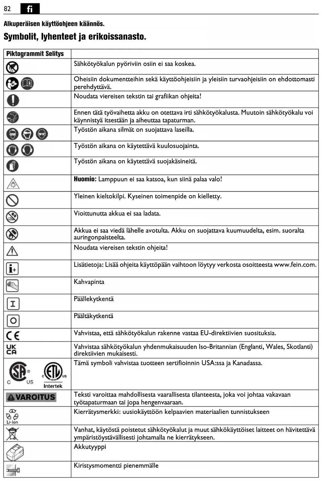 Alkuperäisen käyttöohjeen käännös. Symbolit, lyhenteet ja erikoissanasto. Piktogrammit Selitys Sähkötyökalun pyöriviin osiin ei saa koskea. Oheisiin dokumentteihin sekä käyttöohjeisiin ja yleisiin turvaohjeisiin on ehdottomasti perehdyttävä. Noudata viereisen tekstin tai grafiikan ohjeita! Ennen tätä työvaihetta akku on otettava irti sähkötyökalusta. Muutoin sähkötyökalu voi käynnistyä itsestään ja aiheuttaa tapaturman. Työstön aikana silmät on suojattava laseilla. Työstön aikana on käytettävä kuulosuojainta. Työstön aikana on käytettävä suojakäsineitä. Huomio: Lamppuun ei saa katsoa, kun siinä palaa valo! Yleinen kieltokilpi. Kyseinen toimenpide on kielletty. Vioittunutta akkua ei saa ladata. Akkua ei saa viedä lähelle avotulta. Akku on suojattava kuumuudelta, esim. suoralta auringonpaisteelta. Noudata viereisen tekstin ohjeita! Lisätietoja: Lisää ohjeita käyttöpään vaihtoon löytyy verkosta osoitteesta www.fein.com. Kahvapinta Päällekytkentä Päältäkytkentä Vahvistaa, että sähkötyökalun rakenne vastaa EU-direktiivien suosituksia. Vahvistaa sähkötyökalun yhdenmukaisuuden Iso-Britannian (Englanti, Wales, Skotlanti) direktiivien mukaisesti. Tämä symboli vahvistaa tuotteen sertifioinnin USA:ssa ja Kanadassa. Teksti varoittaa mahdollisesta vaarallisesta tilanteesta, joka voi johtaa vakavaan työtapaturmaan tai jopa hengenvaaraan. Kierrätysmerkki: uusiokäyttöön kelpaavien materiaalien tunnistukseen Vanhat, käytöstä poistetut sähkötyökalut ja muut sähkökäyttöiset laitteet on hävitettävä ympäristöystävällisesti johtamalla ne kierrätykseen. Akkutyyppi Kiristysmomentti pienemmälle83