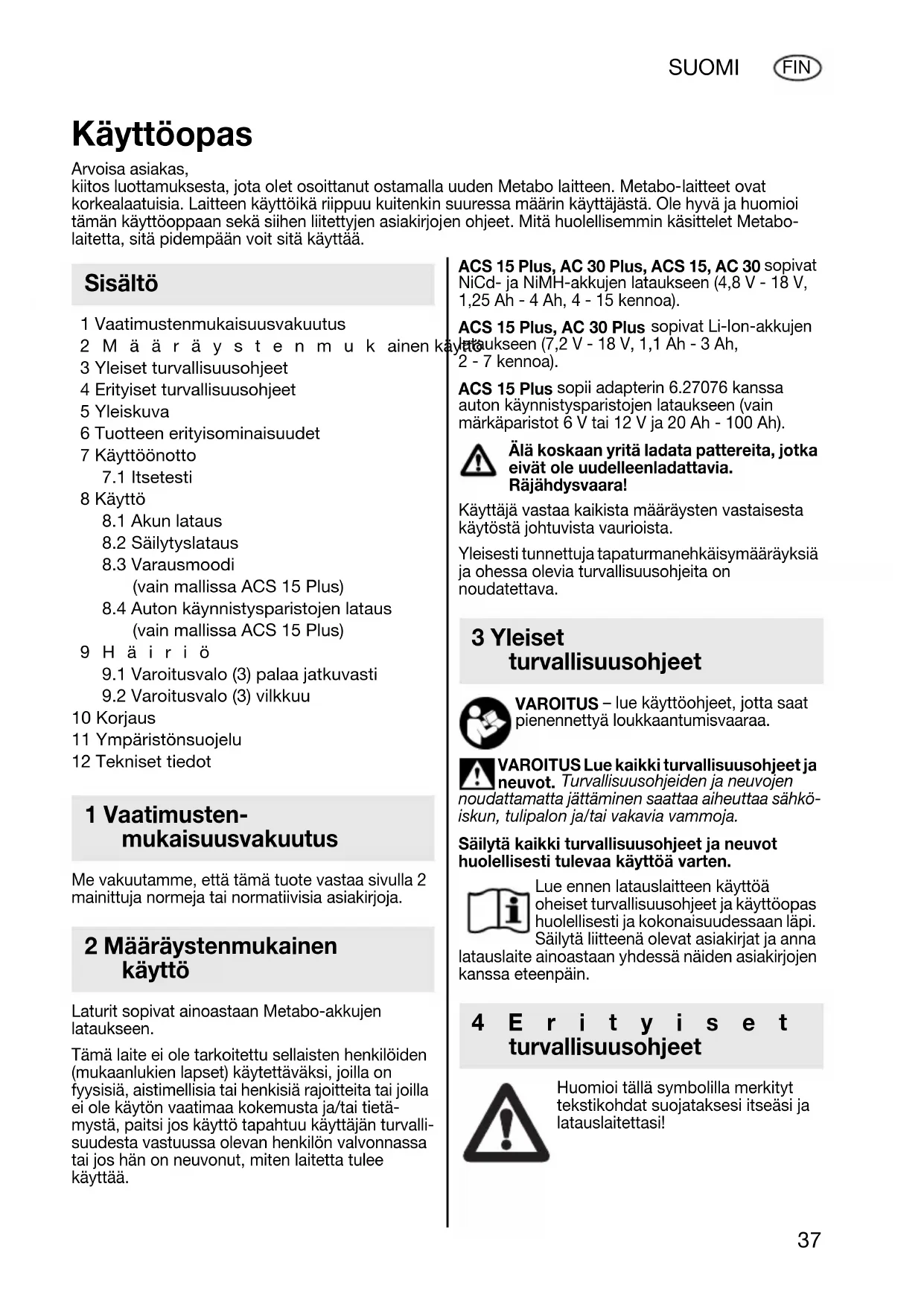 10 Korjaus 11 Ympäristönsuojelu 12 Tekniset tiedot Me vakuutamme, että tämä tuote vastaa sivulla 2 mainittuja normeja tai normatiivisia asiakirjoja. Laturit sopivat ainoastaan Metabo-akkujen lataukseen. Tämä laite ei ole tarkoitettu sellaisten henkilöiden (mukaanlukien lapset) käytettäväksi, joilla on fyysisiä, aistimellisia tai henkisiä rajoitteita tai joilla ei ole käytön vaatimaa kokemusta ja/tai tietä- mystä, paitsi jos käyttö tapahtuu käyttäjän turvalli- suudesta vastuussa olevan henkilön valvonnassa tai jos hän on neuvonut, miten laitetta tulee käyttää. ACS 15 Plus, AC 30 Plus, ACS 15, AC 30 sopivat NiCd- ja NiMH-akkujen lataukseen (4,8 V - 18 V, 1,25 Ah - 4 Ah, 4 - 15 kennoa). ACS 15 Plus, AC 30 Plus sopivat Li-Ion-akkujen lataukseen (7,2 V - 18 V, 1,1 Ah - 3 Ah,