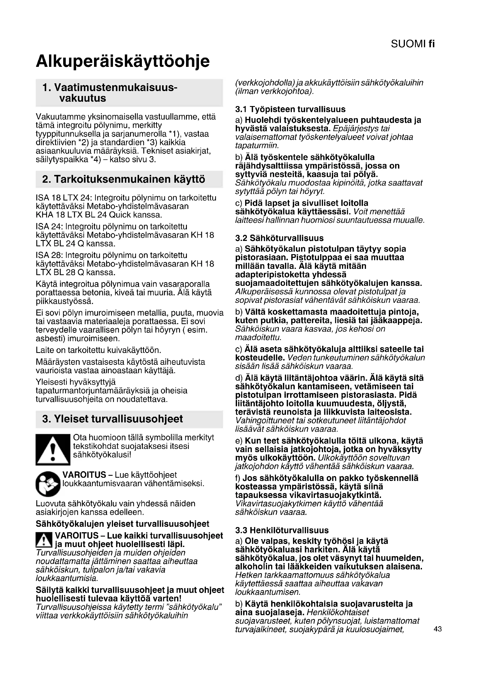 Alkuperäiskäyttöohje Vakuutamme yksinomaisella vastuullamme, että tämä integroitu pölynimu, merkitty tyyppitunnuksella ja sarjanumerolla *1), vastaa direktiivien *2) ja standardien *3) kaikkia asiaankuuluvia määräyksiä. Tekniset asiakirjat, säilytyspaikka *4) – katso sivu 3. ISA 18 LTX 24: Integroitu pölynimu on tarkoitettu käytettäväksi Metabo-yhdistelmävasaran KHA 18 LTX BL 24 Quick kanssa. ISA 24: Integroitu pölynimu on tarkoitettu käytettäväksi Metabo-yhdistelmävasaran KH 18 LTX BL 24 Q kanssa. ISA 28: Integroitu pölynimu on tarkoitettu käytettäväksi Metabo-yhdistelmävasaran KH 18 LTX BL 28 Q kanssa. Käytä integroitua pölynimua vain vasaraporalla porattaessa betonia, kiveä tai muuria. Älä käytä piikkaustyössä. Ei sovi pölyn imuroimiseen metallia, puuta, muovia tai vastaavia materiaaleja porattaessa. Ei sovi terveydelle vaarallisen pölyn tai höyryn ( esim. asbesti) imuroimiseen. Laite on tarkoitettu kuivakäyttöön. Määräysten vastaisesta käytöstä aiheutuvista vaurioista vastaa ainoastaan käyttäjä. Yleisesti hyväksyttyjä tapaturmantorjuntamääräyksiä ja oheisia turvallisuusohjeita on noudatettava. Ota huomioon tällä symbolilla merkityt tekstikohdat suojataksesi itsesi sähkötyökalusi! VAROITUS – Lue käyttöohjeet loukkaantumisvaaran vähentämiseksi. Luovuta sähkötyökalu vain yhdessä näiden asiakirjojen kanssa edelleen. Sähkötyökalujen yleiset turvallisuusohjeet VAROITUS – Lue kaikki turvallisuusohjeet ja muut ohjeet huolellisesti läpi. Turvallisuusohjeiden ja muiden ohjeiden noudattamatta jättäminen saattaa aiheuttaa sähköiskun, tulipalon ja/tai vakavia loukkaantumisia. Säilytä kaikki turvallisuusohjeet ja muut ohjeet huolellisesti tulevaa käyttöä varten! Turvallisuusohjeissa käytetty termi ”sähkötyökalu” viittaa verkkokäyttöisiin sähkötyökaluihin (verkkojohdolla) ja akkukäyttöisiin sähkötyökaluihin (ilman verkkojohtoa).