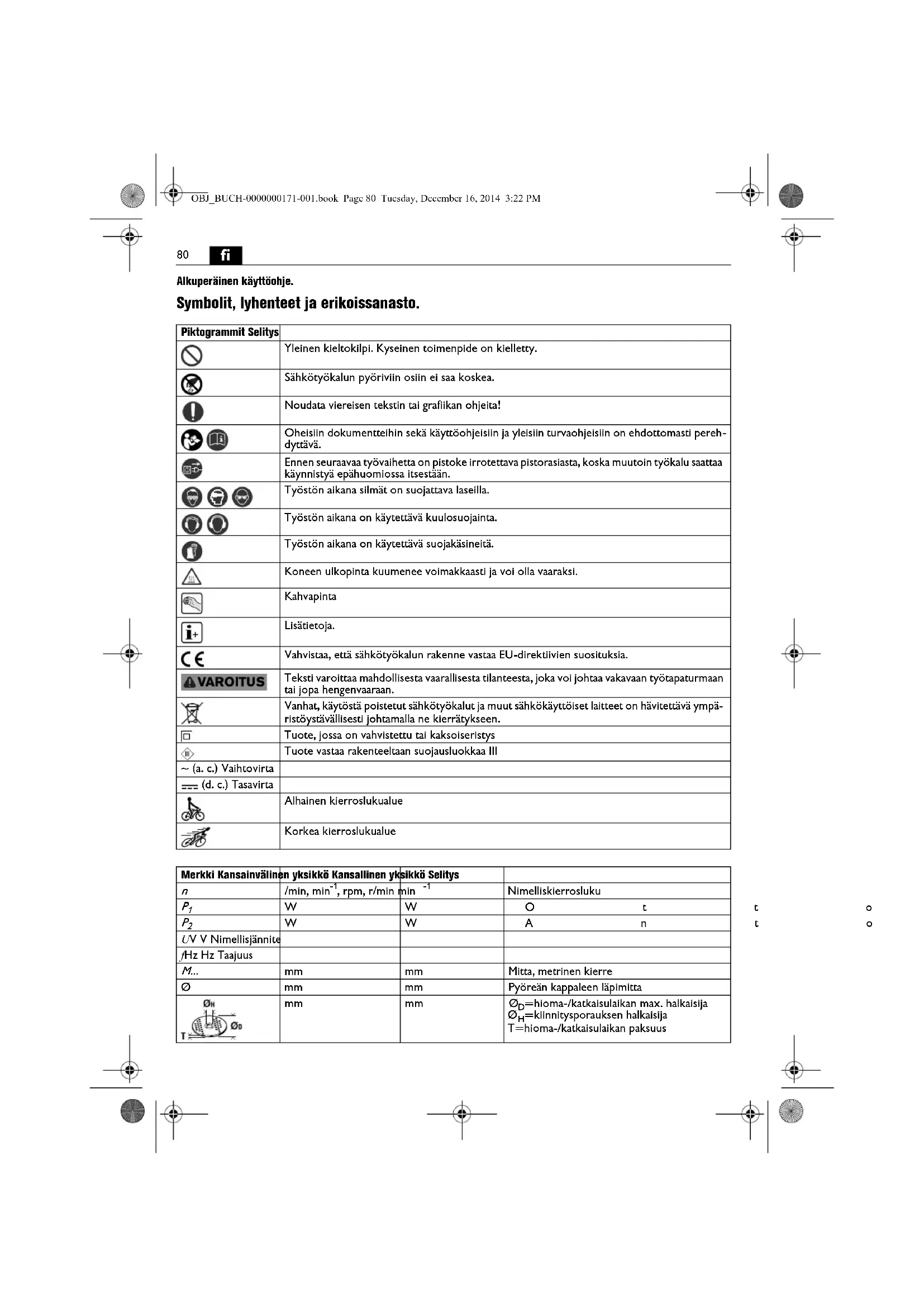 Alkuperäinen käyttöohje. Symbolit, lyhenteet ja erikoissanasto. Piktogrammit Selitys Yleinen kieltokilpi. Kyseinen toimenpide on kielletty. Sähkötyökalun pyöriviin osiin ei saa koskea. Noudata viereisen tekstin tai grafiikan ohjeita! Oheisiin dokumentteihin sekä käyttöohjeisiin ja yleisiin turvaohjeisiin on ehdottomasti pereh- dyttävä. Ennen seuraavaa työvaihetta on pistoke irrotettava pistorasiasta, koska muutoin työkalu saattaa käynnistyä epähuomiossa itsestään. Työstön aikana silmät on suojattava laseilla. Työstön aikana on käytettävä kuulosuojainta. Työstön aikana on käytettävä suojakäsineitä. Koneen ulkopinta kuumenee voimakkaasti ja voi olla vaaraksi. Kahvapinta Lisätietoja. Vahvistaa, että sähkötyökalun rakenne vastaa EU-direktiivien suosituksia. Teksti varoittaa mahdollisesta vaarallisesta tilanteesta, joka voi johtaa vakavaan työtapaturmaan tai jopa hengenvaaraan. Vanhat, käytöstä poistetut sähkötyökalut ja muut sähkökäyttöiset laitteet on hävitettävä ympä- ristöystävällisesti johtamalla ne kierrätykseen. Tuote, jossa on vahvistettu tai kaksoiseristys Tuote vastaa rakenteeltaan suojausluokkaa III ~ (a. c.) Vaihtovirta (d. c.) Tasavirta Alhainen kierroslukualue Korkea kierroslukualue Merkki Kansainvälinen yksikkö Kansallinen yksikkö Selitys