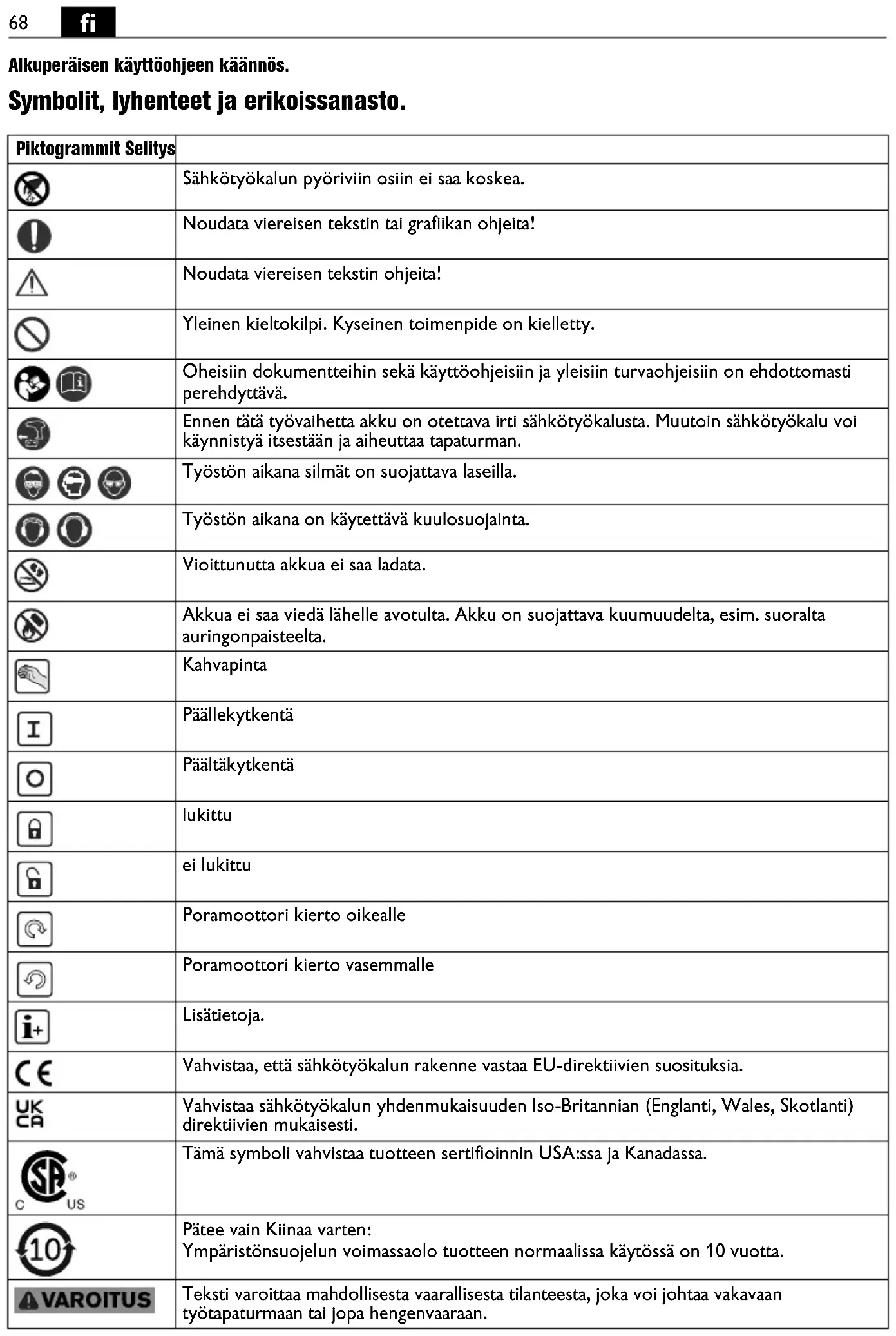 Alkuperäisen käyttöohjeen käännös. Symbolit, lyhenteet ja erikoissanasto. Piktogrammit Selitys Sähkötyökalun pyöriviin osiin ei saa koskea. Noudata viereisen tekstin tai grafiikan ohjeita! Noudata viereisen tekstin ohjeita! Yleinen kieltokilpi. Kyseinen toimenpide on kielletty. Oheisiin dokumentteihin sekä käyttöohjeisiin ja yleisiin turvaohjeisiin on ehdottomasti perehdyttävä. Ennen tätä työvaihetta akku on otettava irti sähkötyökalusta. Muutoin sähkötyökalu voi käynnistyä itsestään ja aiheuttaa tapaturman. Työstön aikana silmät on suojattava laseilla. Työstön aikana on käytettävä kuulosuojainta. Vioittunutta akkua ei saa ladata. Akkua ei saa viedä lähelle avotulta. Akku on suojattava kuumuudelta, esim. suoralta auringonpaisteelta. Kahvapinta Päällekytkentä Päältäkytkentä lukittu ei lukittu Poramoottori kierto oikealle Poramoottori kierto vasemmalle Lisätietoja. Vahvistaa, että sähkötyökalun rakenne vastaa EU-direktiivien suosituksia. Vahvistaa sähkötyökalun yhdenmukaisuuden Iso-Britannian (Englanti, Wales, Skotlanti) direktiivien mukaisesti. Tämä symboli vahvistaa tuotteen sertifioinnin USA:ssa ja Kanadassa. Pätee vain Kiinaa varten: Ympäristönsuojelun voimassaolo tuotteen normaalissa käytössä on 10 vuotta. Teksti varoittaa mahdollisesta vaarallisesta tilanteesta, joka voi johtaa vakavaan työtapaturmaan tai jopa hengenvaaraan.69
