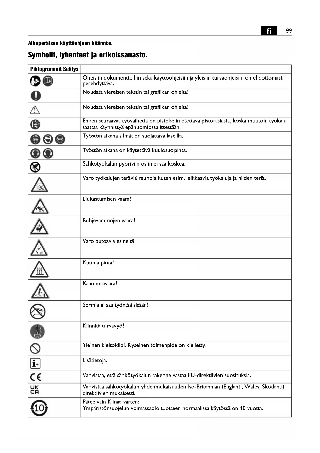 Alkuperäisen käyttöohjeen käännös. Symbolit, lyhenteet ja erikoissanasto. Piktogrammit Selitys Oheisiin dokumentteihin sekä käyttöohjeisiin ja yleisiin turvaohjeisiin on ehdottomasti perehdyttävä. Noudata viereisen tekstin tai grafiikan ohjeita! Noudata viereisen tekstin tai grafiikan ohjeita! Ennen seuraavaa työvaihetta on pistoke irrotettava pistorasiasta, koska muutoin työkalu saattaa käynnistyä epähuomiossa itsestään. Työstön aikana silmät on suojattava laseilla. Työstön aikana on käytettävä kuulosuojainta. Sähkötyökalun pyöriviin osiin ei saa koskea. Varo työkalujen teräviä reunoja kuten esim. leikkaavia työkaluja ja niiden teriä. Liukastumisen vaara! Ruhjevammojen vaara! Varo putoavia esineitä! Kuuma pinta! Kaatumisvaara! Sormia ei saa työntää sisään! Kiinnitä turvavyö! Yleinen kieltokilpi. Kyseinen toimenpide on kielletty. Lisätietoja. Vahvistaa, että sähkötyökalun rakenne vastaa EU-direktiivien suosituksia. Vahvistaa sähkötyökalun yhdenmukaisuuden Iso-Britannian (Englanti, Wales, Skotlanti) direktiivien mukaisesti. Pätee vain Kiinaa varten: Ympäristönsuojelun voimassaolo tuotteen normaalissa käytössä on 10 vuotta.100