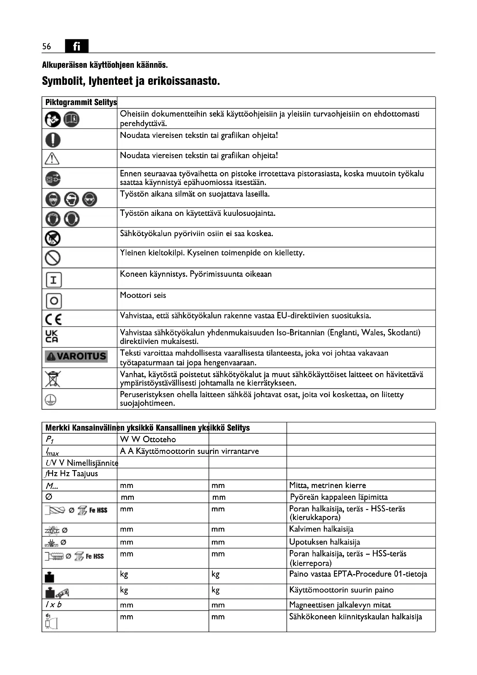 max A A Käyttömoottorin suurin virrantarve U V V Nimellisjännite f Hz Hz Taajuus M... mm mm Mitta, metrinen kierre Ø mm mm Pyöreän kappaleen läpimitta mm mm Poran halkaisija, teräs - HSS-teräs (kierukkapora) mm mm Kalvimen halkaisija mm mm Upotuksen halkaisija mm mm Poran halkaisija, teräs – HSS-teräs (kierrepora) kg kg Paino vastaa EPTA-Procedure 01-tietoja kg kg Käyttömoottorin suurin paino l x b mm mm Magneettisen jalkalevyn mitat mm mm Sähkökoneen kiinnityskaulan halkaisija Fe HSS57