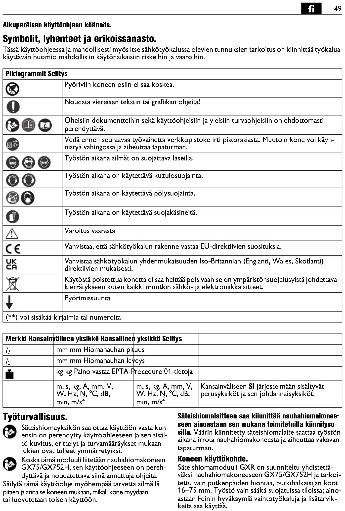 Tässä käyttoohjeessa ja mahdollisesti myös itse sähkötyokalussa olevien tunnuksien tarkoitus on kiinnittä tyokalua käyttavan huomio mahdollisiin käytönaikaisin riskeihin ja vaaroihin.