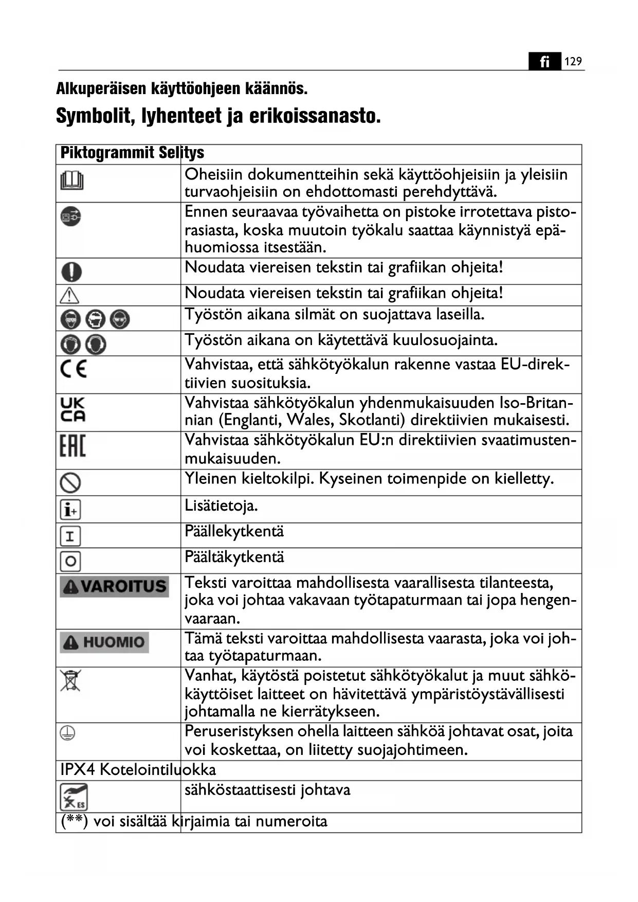 Alkuperäisen käyttöohjeen käännös. Symbolit, lyhenteet ja erikoissanasto. Piktogrammit Selitys Oheisiin dokumentteihin sekä käyttöohjeisiin ja yleisiin turvaohjeisiin on ehdottomasti perehdyttävä. Ennen seuraavaa työvaihetta on pistoke irrotettava pisto- rasiasta, koska muutoin työkalu saattaa käynnistyä epä- huomiossa itsestään. Noudata viereisen tekstin tai grafiikan ohjeita! Noudata viereisen tekstin tai grafiikan ohjeita! Työstön aikana silmät on suojattava laseilla. Työstön aikana on käytettävä kuulosuojainta. Vahvistaa, että sähkötyökalun rakenne vastaa EU-direk- tiivien suosituksia. Vahvistaa sähkötyökalun yhdenmukaisuuden Iso-Britan- nian (Englanti, Wales, Skotlanti) direktiivien mukaisesti. Vahvistaa sähkötyökalun EU:n direktiivien svaatimusten- mukaisuuden. Yleinen kieltokilpi. Kyseinen toimenpide on kielletty. Lisätietoja. Päällekytkentä Päältäkytkentä Teksti varoittaa mahdollisesta vaarallisesta tilanteesta, joka voi johtaa vakavaan työtapaturmaan tai jopa hengen- vaaraan. Tämä teksti varoittaa mahdollisesta vaarasta, joka voi joh- taa työtapaturmaan. Vanhat, käytöstä poistetut sähkötyökalut ja muut sähkö- käyttöiset laitteet on hävitettävä ympäristöystävällisesti johtamalla ne kierrätykseen. Peruseristyksen ohella laitteen sähköä johtavat osat, joita voi koskettaa, on liitetty suojajohtimeen. IPX4 Kotelointiluokka sähköstaattisesti johtava (**) voi sisältää kirjaimia tai numeroita130