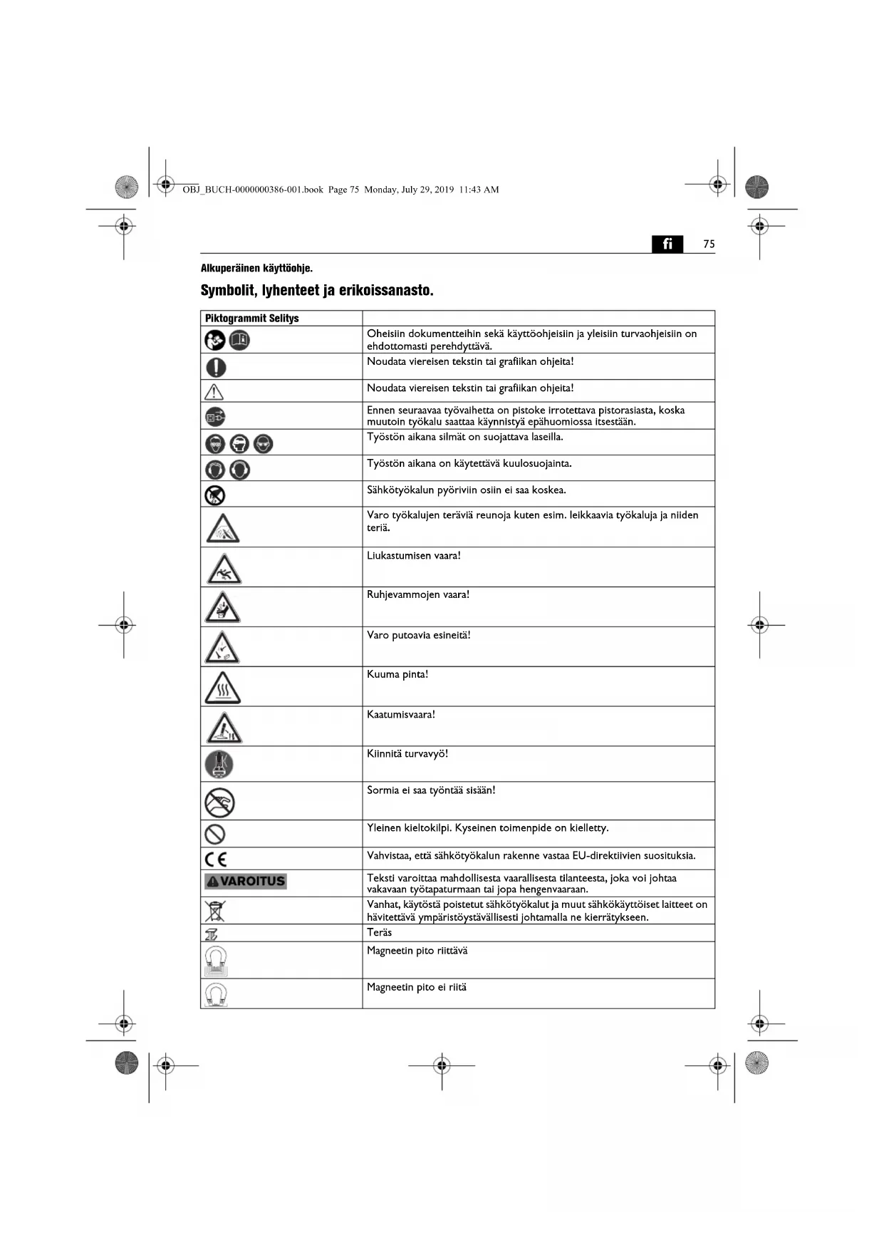 Alkuperäinen käyttöohje. Symbolit, lyhenteet ja erikoissanasto. Piktogrammit Selitys Oheisiin dokumentteihin sekä käyttöohjeisiin ja yleisiin turvaohjeisiin on ehdottomasti perehdyttävä. Noudata viereisen tekstin tai grafiikan ohjeita! Noudata viereisen tekstin tai grafiikan ohjeita! Ennen seuraavaa työvaihetta on pistoke irrotettava pistorasiasta, koska muutoin työkalu saattaa käynnistyä epähuomiossa itsestään. Työstön aikana silmät on suojattava laseilla. Työstön aikana on käytettävä kuulosuojainta. Sähkötyökalun pyöriviin osiin ei saa koskea. Varo työkalujen teräviä reunoja kuten esim. leikkaavia työkaluja ja niiden teriä. Liukastumisen vaara! Ruhjevammojen vaara! Varo putoavia esineitä! Kuuma pinta! Kaatumisvaara! Kiinnitä turvavyö! Sormia ei saa työntää sisään! Yleinen kieltokilpi. Kyseinen toimenpide on kielletty. Vahvistaa, että sähkötyökalun rakenne vastaa EU-direktiivien suosituksia. Teksti varoittaa mahdollisesta vaarallisesta tilanteesta, joka voi johtaa vakavaan työtapaturmaan tai jopa hengenvaaraan. Vanhat, käytöstä poistetut sähkötyökalut ja muut sähkökäyttöiset laitteet on hävitettävä ympäristöystävällisesti johtamalla ne kierrätykseen. Teräs Magneetin pito riittävä Magneetin pito ei riitä OBJ_BUCH-0000000386-001.book Page 75 Monday, July 29, 2019 11:43 AM76