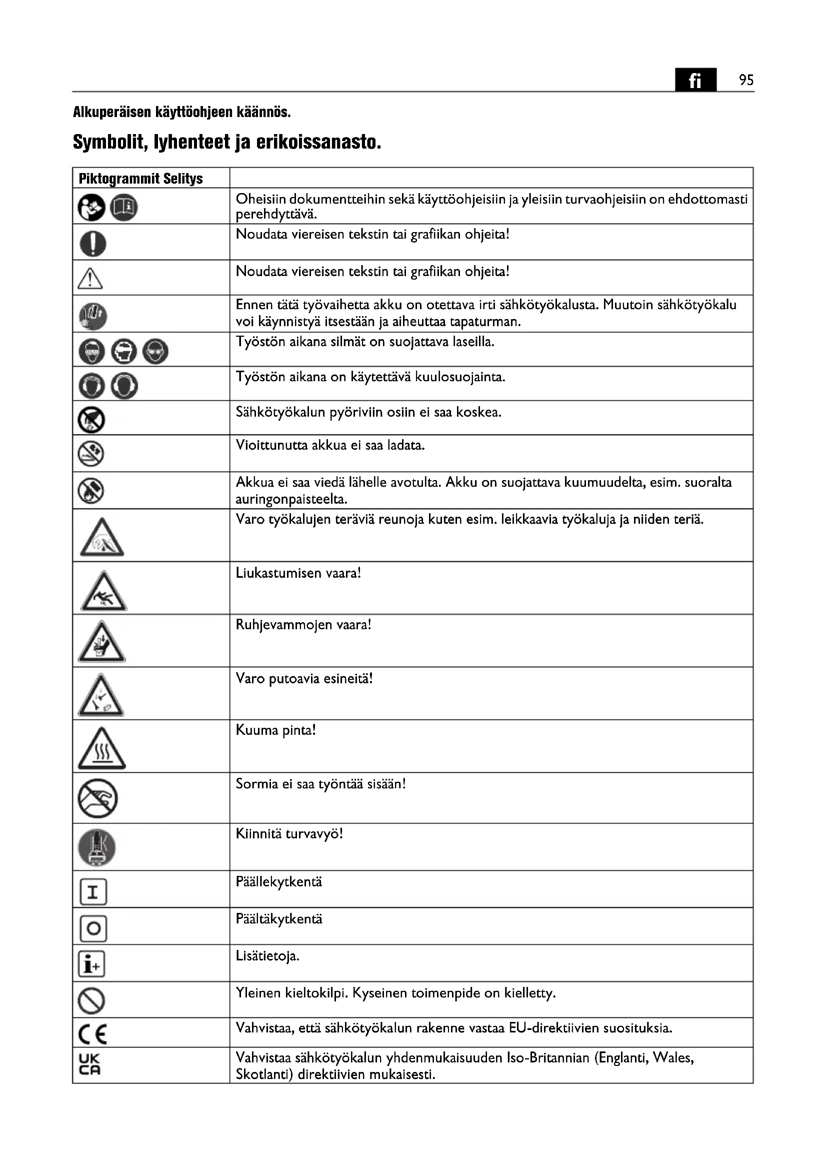 Alkuperäisen käyttöohjeen käännös. Symbolit, lyhenteet ja erikoissanasto. Piktogrammit Selitys Oheisiin dokumentteihin sekä käyttöohjeisiin ja yleisiin turvaohjeisiin on ehdottomasti perehdyttävä. Noudata viereisen tekstin tai grafiikan ohjeita! Noudata viereisen tekstin tai grafiikan ohjeita! Ennen tätä työvaihetta akku on otettava irti sähkötyökalusta. Muutoin sähkötyökalu voi käynnistyä itsestään ja aiheuttaa tapaturman. Työstön aikana silmät on suojattava laseilla. Työstön aikana on käytettävä kuulosuojainta. Sähkötyökalun pyöriviin osiin ei saa koskea. Vioittunutta akkua ei saa ladata. Akkua ei saa viedä lähelle avotulta. Akku on suojattava kuumuudelta, esim. suoralta auringonpaisteelta. Varo työkalujen teräviä reunoja kuten esim. leikkaavia työkaluja ja niiden teriä. Liukastumisen vaara! Ruhjevammojen vaara! Varo putoavia esineitä! Kuuma pinta! Sormia ei saa työntää sisään! Kiinnitä turvavyö! Päällekytkentä Päältäkytkentä Lisätietoja. Yleinen kieltokilpi. Kyseinen toimenpide on kielletty. Vahvistaa, että sähkötyökalun rakenne vastaa EU-direktiivien suosituksia. Vahvistaa sähkötyökalun yhdenmukaisuuden Iso-Britannian (Englanti, Wales, Skotlanti) direktiivien mukaisesti.96