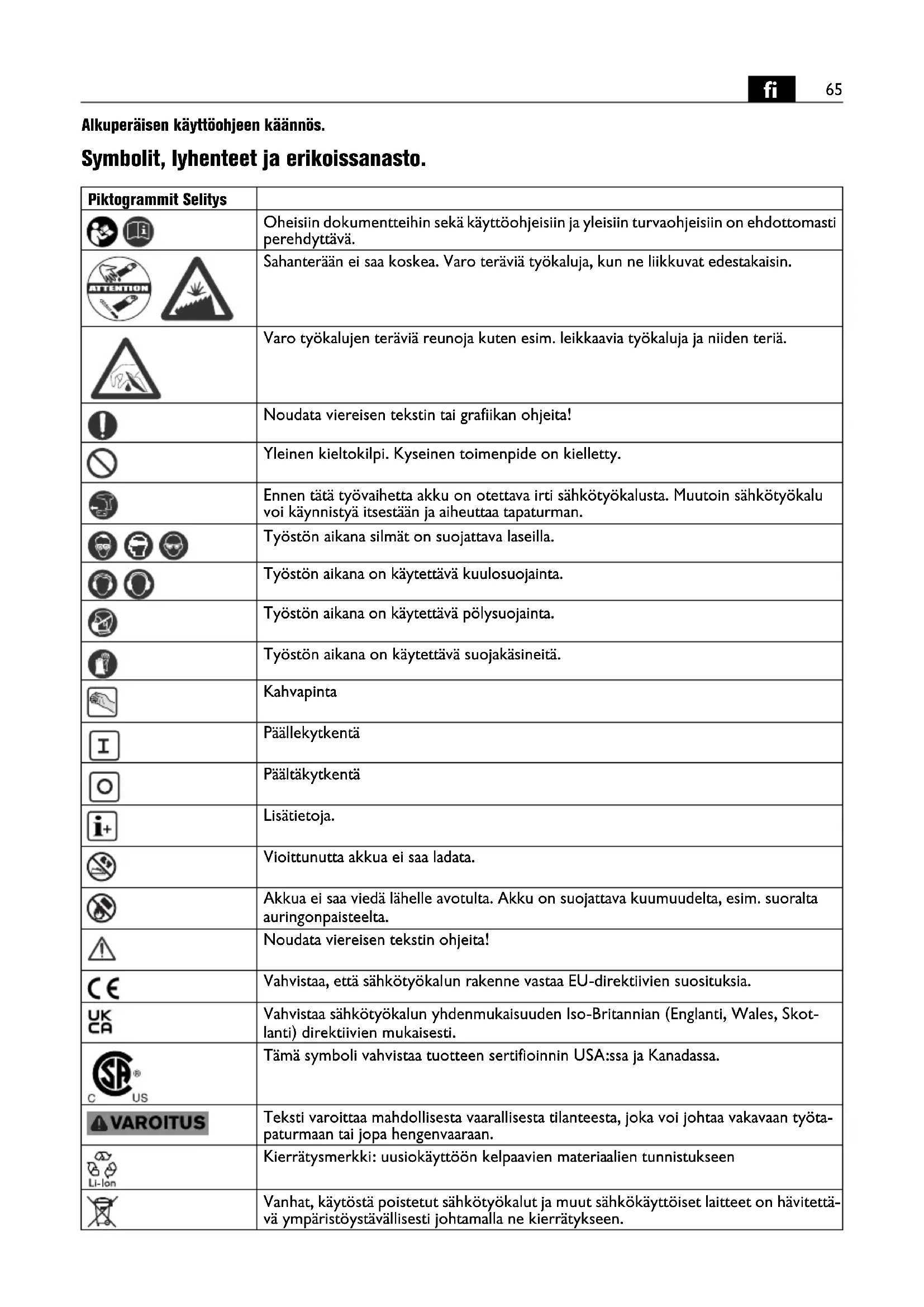 Alkuperäisen käyttöohjeen käännös. Symbolit, lyhenteet ja erikoissanasto. Piktogrammit Selitys Oheisiin dokumentteihin sekä käyttöohjeisiin ja yleisiin turvaohjeisiin on ehdottomasti perehdyttävä. Sahanterään ei saa koskea. Varo teräviä työkaluja, kun ne liikkuvat edestakaisin. Varo työkalujen teräviä reunoja kuten esim. leikkaavia työkaluja ja niiden teriä. Noudata viereisen tekstin tai grafiikan ohjeita! Yleinen kieltokilpi. Kyseinen toimenpide on kielletty. Ennen tätä työvaihetta akku on otettava irti sähkötyökalusta. Muutoin sähkötyökalu voi käynnistyä itsestään ja aiheuttaa tapaturman. Työstön aikana silmät on suojattava laseilla. Työstön aikana on käytettävä kuulosuojainta. Työstön aikana on käytettävä pölysuojainta. Työstön aikana on käytettävä suojakäsineitä. Kahvapinta Päällekytkentä Päältäkytkentä Lisätietoja. Vioittunutta akkua ei saa ladata. Akkua ei saa viedä lähelle avotulta. Akku on suojattava kuumuudelta, esim. suoralta auringonpaisteelta. Noudata viereisen tekstin ohjeita! Vahvistaa, että sähkötyökalun rakenne vastaa EU-direktiivien suosituksia. Vahvistaa sähkötyökalun yhdenmukaisuuden Iso-Britannian (Englanti, Wales, Skot- lanti) direktiivien mukaisesti. Tämä symboli vahvistaa tuotteen sertifioinnin USA:ssa ja Kanadassa. Teksti varoittaa mahdollisesta vaarallisesta tilanteesta, joka voi johtaa vakavaan työta- paturmaan tai jopa hengenvaaraan. Kierrätysmerkki: uusiokäyttöön kelpaavien materiaalien tunnistukseen Vanhat, käytöstä poistetut sähkötyökalut ja muut sähkökäyttöiset laitteet on hävitettä- vä ympäristöystävällisesti johtamalla ne kierrätykseen.66
