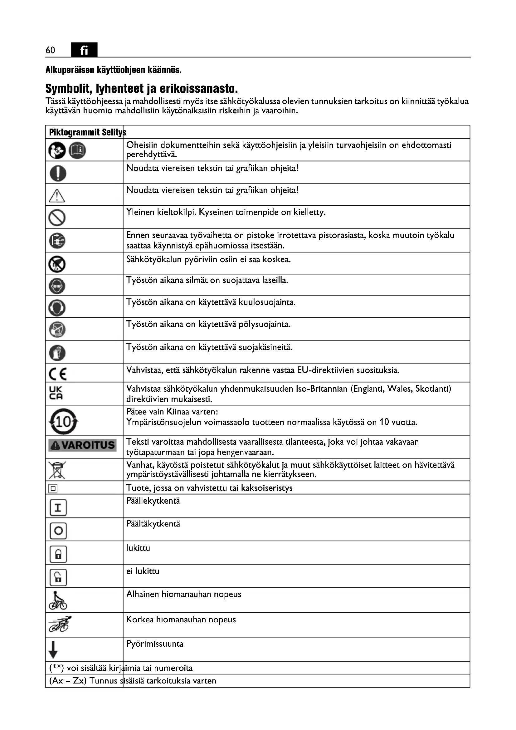 Alkuperäisen käyttöohjeen käännös. Symbolit, lyhenteet ja erikoissanasto. Tässä käyttöohjeessa ja mahdollisesti myös itse sähkötyökalussa olevien tunnuksien tarkoitus on kiinnittää työkalua käyttävän huomio mahdollisiin käytönaikaisiin riskeihin ja vaaroihin. Piktogrammit Selitys Oheisiin dokumentteihin sekä käyttöohjeisiin ja yleisiin turvaohjeisiin on ehdottomasti perehdyttävä. Noudata viereisen tekstin tai grafiikan ohjeita! Noudata viereisen tekstin tai grafiikan ohjeita! Yleinen kieltokilpi. Kyseinen toimenpide on kielletty. Ennen seuraavaa työvaihetta on pistoke irrotettava pistorasiasta, koska muutoin työkalu saattaa käynnistyä epähuomiossa itsestään. Sähkötyökalun pyöriviin osiin ei saa koskea. Työstön aikana silmät on suojattava laseilla. Työstön aikana on käytettävä kuulosuojainta. Työstön aikana on käytettävä pölysuojainta. Työstön aikana on käytettävä suojakäsineitä. Vahvistaa, että sähkötyökalun rakenne vastaa EU-direktiivien suosituksia. Vahvistaa sähkötyökalun yhdenmukaisuuden Iso-Britannian (Englanti, Wales, Skotlanti) direktiivien mukaisesti. Pätee vain Kiinaa varten: Ympäristönsuojelun voimassaolo tuotteen normaalissa käytössä on 10 vuotta. Teksti varoittaa mahdollisesta vaarallisesta tilanteesta, joka voi johtaa vakavaan työtapaturmaan tai jopa hengenvaaraan. Vanhat, käytöstä poistetut sähkötyökalut ja muut sähkökäyttöiset laitteet on hävitettävä ympäristöystävällisesti johtamalla ne kierrätykseen. Tuote, jossa on vahvistettu tai kaksoiseristys Päällekytkentä Päältäkytkentä lukittu ei lukittu Alhainen hiomanauhan nopeus Korkea hiomanauhan nopeus Pyörimissuunta (**) voi sisältää kirjaimia tai numeroita (Ax – Zx) Tunnus sisäisiä tarkoituksia varten61
