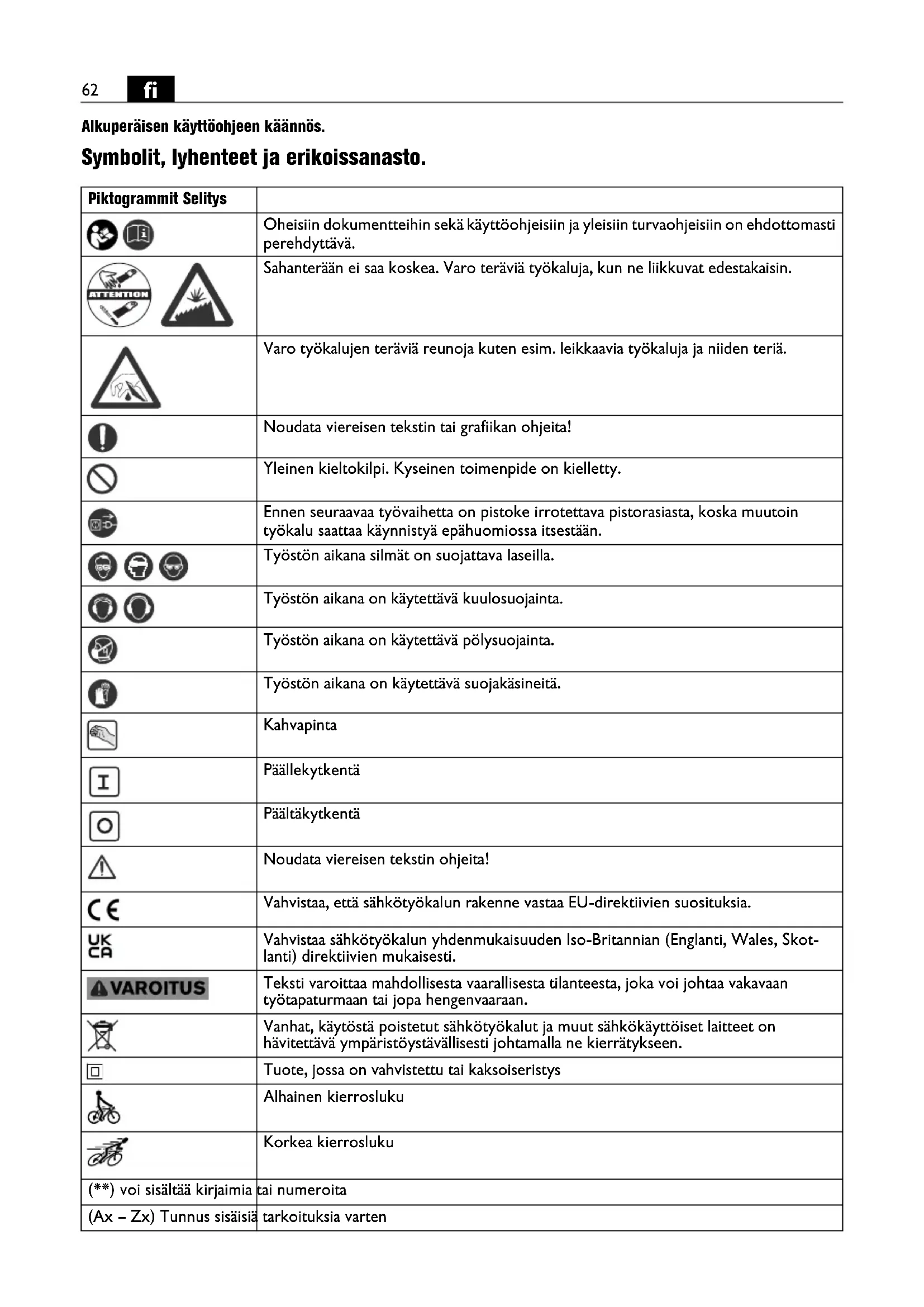 Alkuperäisen käyttöohjeen käännös. Symbolit, lyhenteet ja erikoissanasto. Piktogrammit Selitys Oheisiin dokumentteihin sekä käyttöohjeisiin ja yleisiin turvaohjeisiin on ehdottomasti perehdyttävä. Sahanterään ei saa koskea. Varo teräviä työkaluja, kun ne liikkuvat edestakaisin. Varo työkalujen teräviä reunoja kuten esim. leikkaavia työkaluja ja niiden teriä. Noudata viereisen tekstin tai grafiikan ohjeita! Yleinen kieltokilpi. Kyseinen toimenpide on kielletty. Ennen seuraavaa työvaihetta on pistoke irrotettava pistorasiasta, koska muutoin työkalu saattaa käynnistyä epähuomiossa itsestään. Työstön aikana silmät on suojattava laseilla. Työstön aikana on käytettävä kuulosuojainta. Työstön aikana on käytettävä pölysuojainta. Työstön aikana on käytettävä suojakäsineitä. Kahvapinta Päällekytkentä Päältäkytkentä Noudata viereisen tekstin ohjeita! Vahvistaa, että sähkötyökalun rakenne vastaa EU-direktiivien suosituksia. Vahvistaa sähkötyökalun yhdenmukaisuuden Iso-Britannian (Englanti, Wales, Skot- lanti) direktiivien mukaisesti. Teksti varoittaa mahdollisesta vaarallisesta tilanteesta, joka voi johtaa vakavaan työtapaturmaan tai jopa hengenvaaraan. Vanhat, käytöstä poistetut sähkötyökalut ja muut sähkökäyttöiset laitteet on hävitettävä ympäristöystävällisesti johtamalla ne kierrätykseen. Tuote, jossa on vahvistettu tai kaksoiseristys Alhainen kierrosluku Korkea kierrosluku (**) voi sisältää kirjaimia tai numeroita (Ax – Zx) Tunnus sisäisiä tarkoituksia varten63