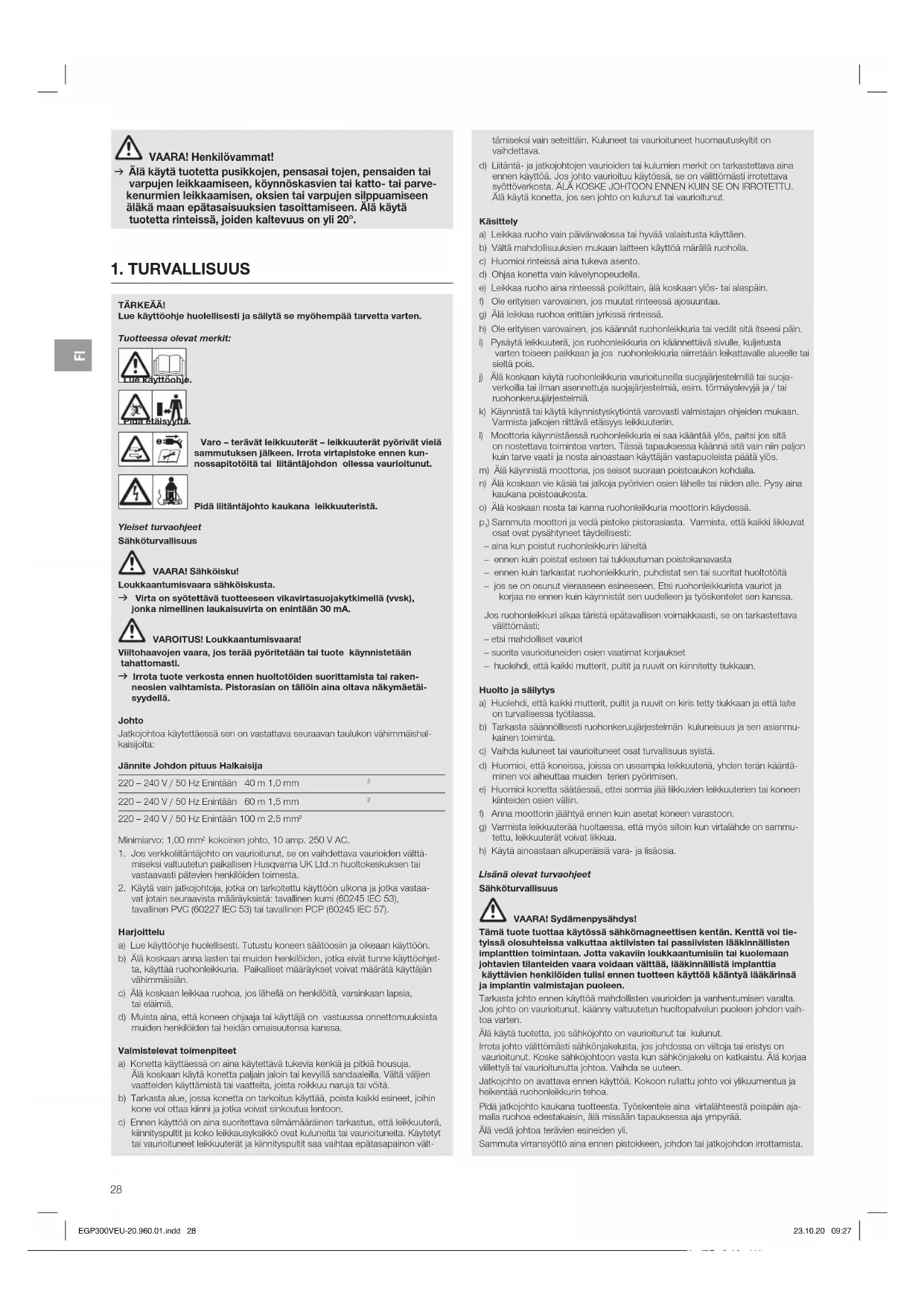 TÄRKEÄÄ! Lue käyttöohje huolellisesti ja säilytä se myöhempää tarvetta varten. Tuotteessa olevat merkit: Lue käyttöohje. Pidä etäisyyttä. Varo – terävät leikkuuterät – leikkuuterät pyörivät vielä sammutuksen jälkeen. Irrota virtapistoke ennen kun- nossapitotöitä tai liitäntäjohdon ollessa vaurioitunut.