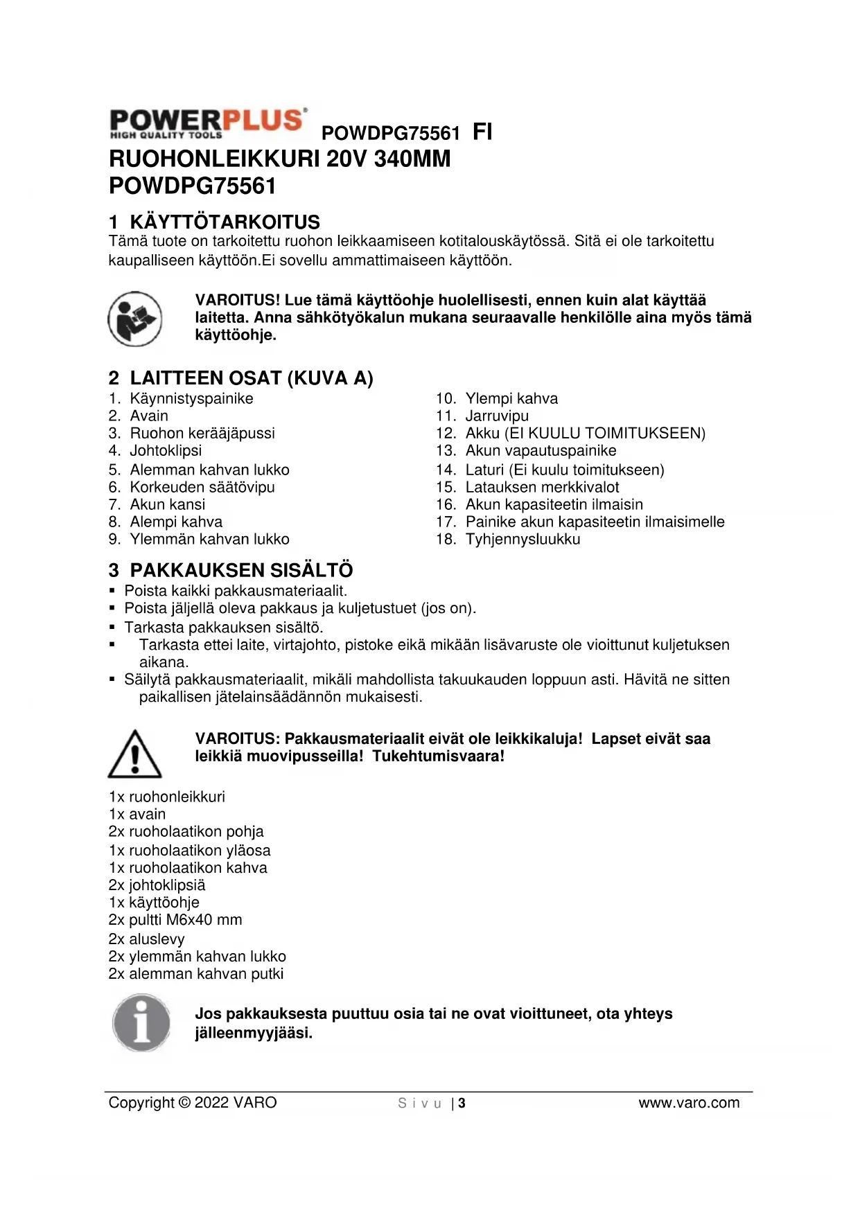- Vaihda kuluneet tai vaurioituneet osat turvallisuuden varmistamiseksi. Käytä vain alkuperäisiä varaosia ja lisävarusteita.POWDPG75561 FI Copyright © 2022 VARO S i v u | 7 www.varo.com