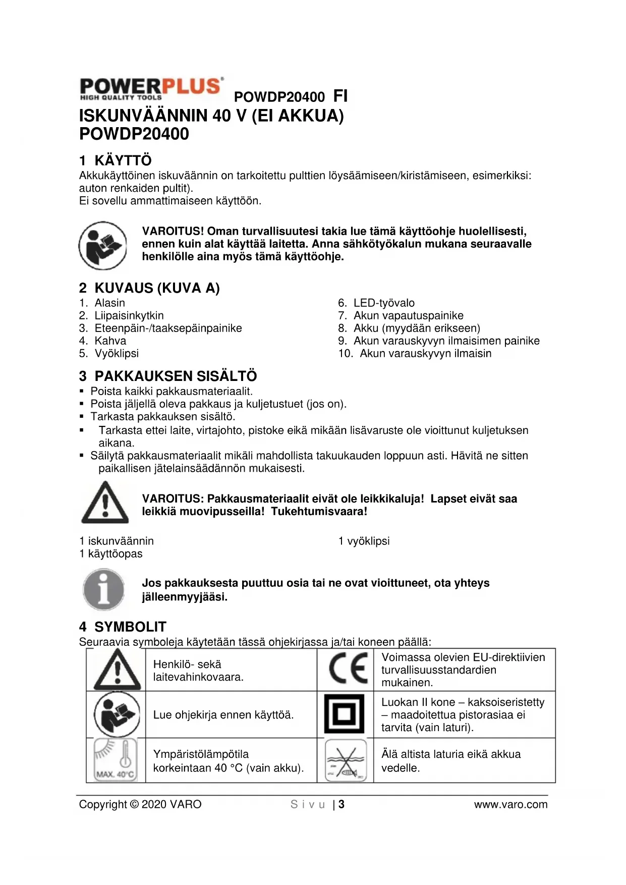 - Akkuja hävitettäessä noudata kohdassa “Ympäristön suojeleminen” annettuja ohjeita.POWDP20400 FI Copyright © 2020 VARO S i v u | 7 www.varo.com