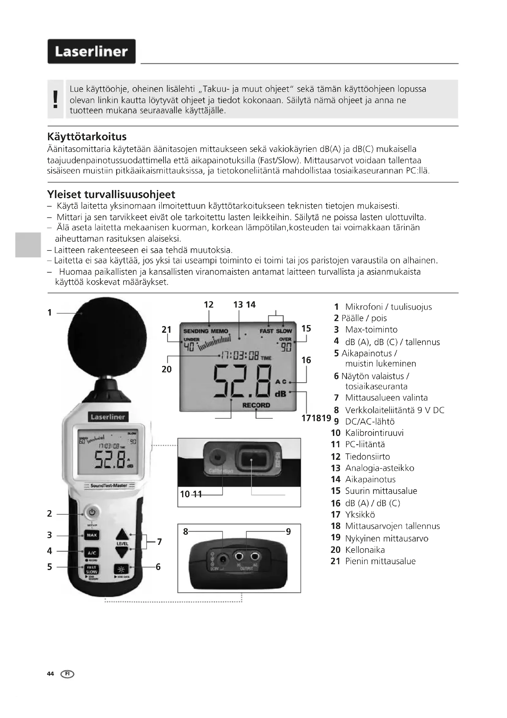 Yleiset turvallisuusohjeet – Käytä laitetta yksinomaan ilmoitettuun käyttötarkoitukseen teknisten tietojen mukaisesti. – Mittari ja sen tarvikkeet eivät ole tarkoitettu lasten leikkeihin. Säilytä ne poissa lasten ulottuvilta. – Älä aseta laitetta mekaanisen kuorman, korkean lämpötilan,kosteuden tai voimakkaan tärinän aiheuttaman rasituksen alaiseksi. – Laitteen rakenteeseen ei saa tehdä muutoksia. – Laitetta ei saa käyttää, jos yksi tai useampi toiminto ei toimi tai jos paristojen varaustila on alhainen. – Huomaa paikallisten ja kansallisten viranomaisten antamat laitteen turvallista ja asianmukaista käyttöä koskevat määräykset.SoundTest-Master