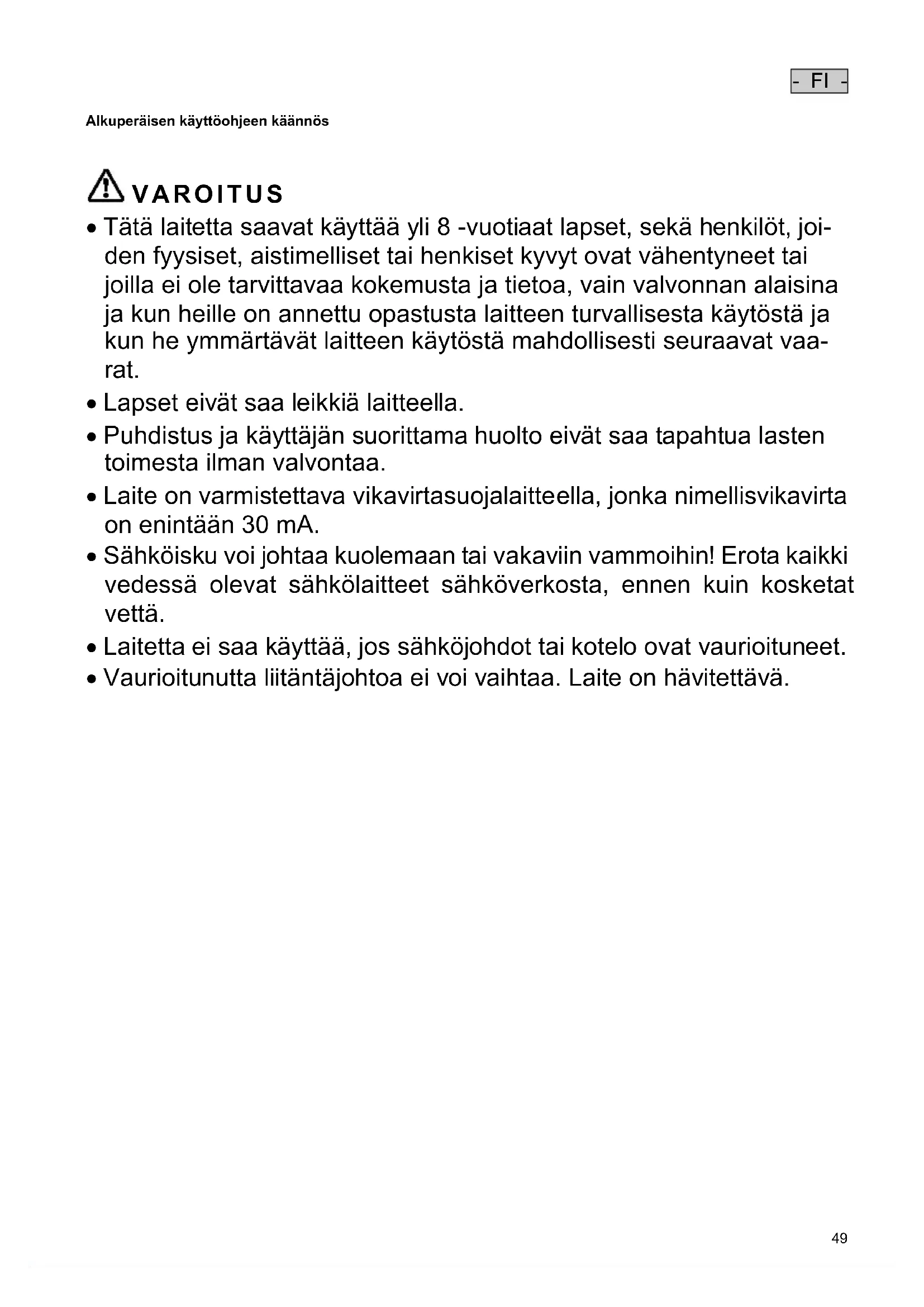 - Vaurioitunutta liitäntäjohtoa ei voi vaihtaa. Laite on hävitettävä.- FI -