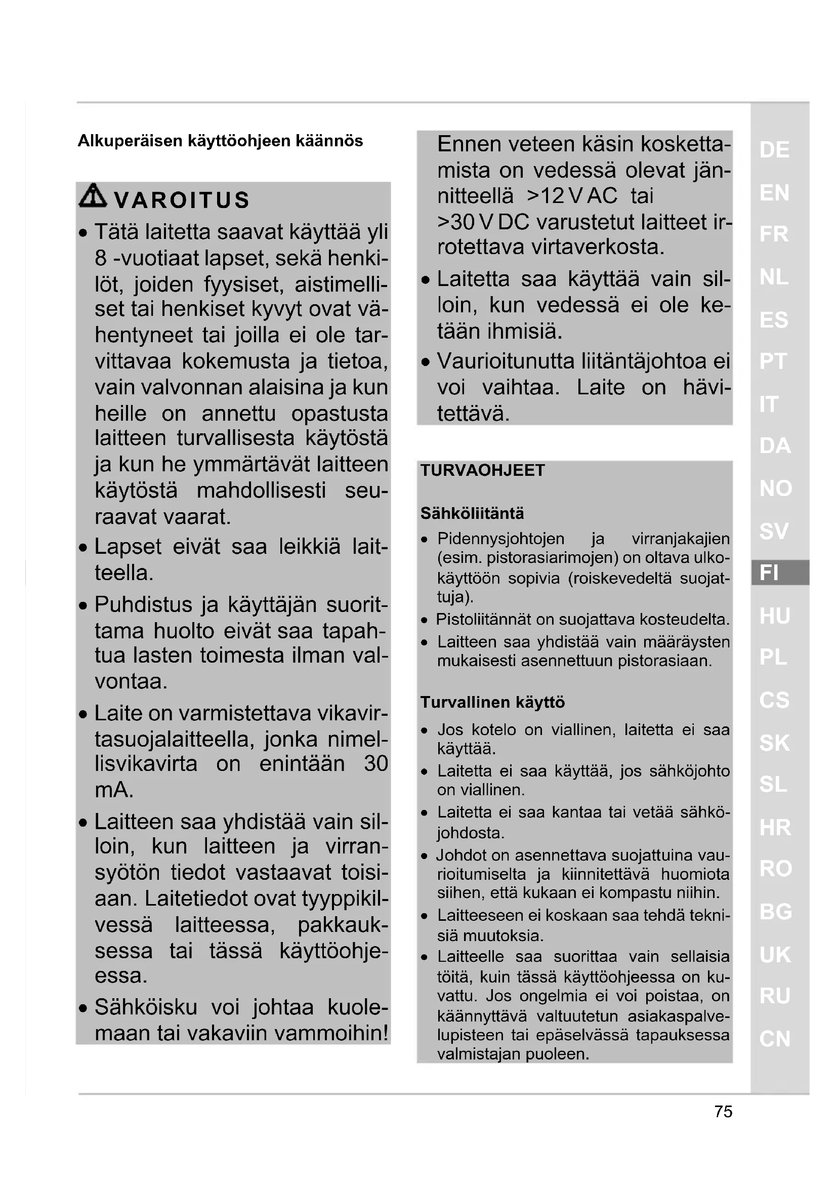 - Ennen veteen menemistä tai veteen koskettamista on kaikkien vedessä ole- vien laitteiden verkkojännite kytkettävä pois päältä. Laitteen kytkeminen päälle