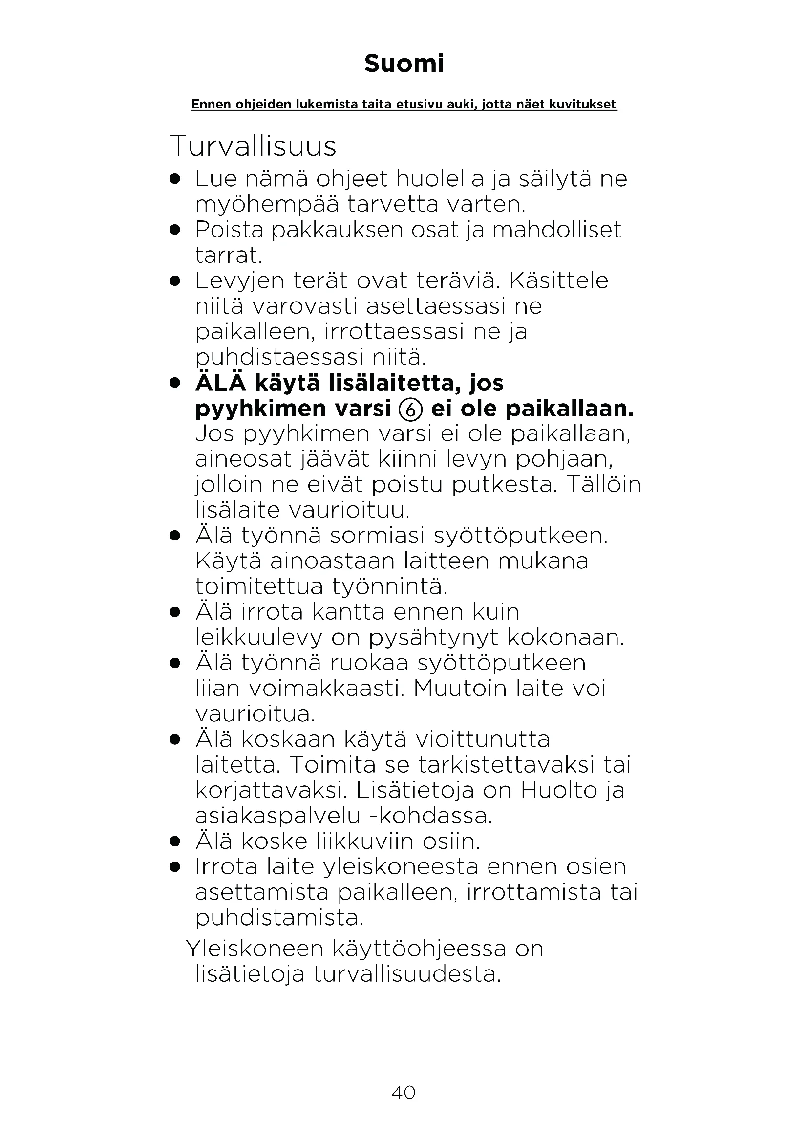 Laget i Kina.40 Suomi Ennen ohjeiden lukemista taita etusivu auki, jotta näet kuvitukset Turvallisuus