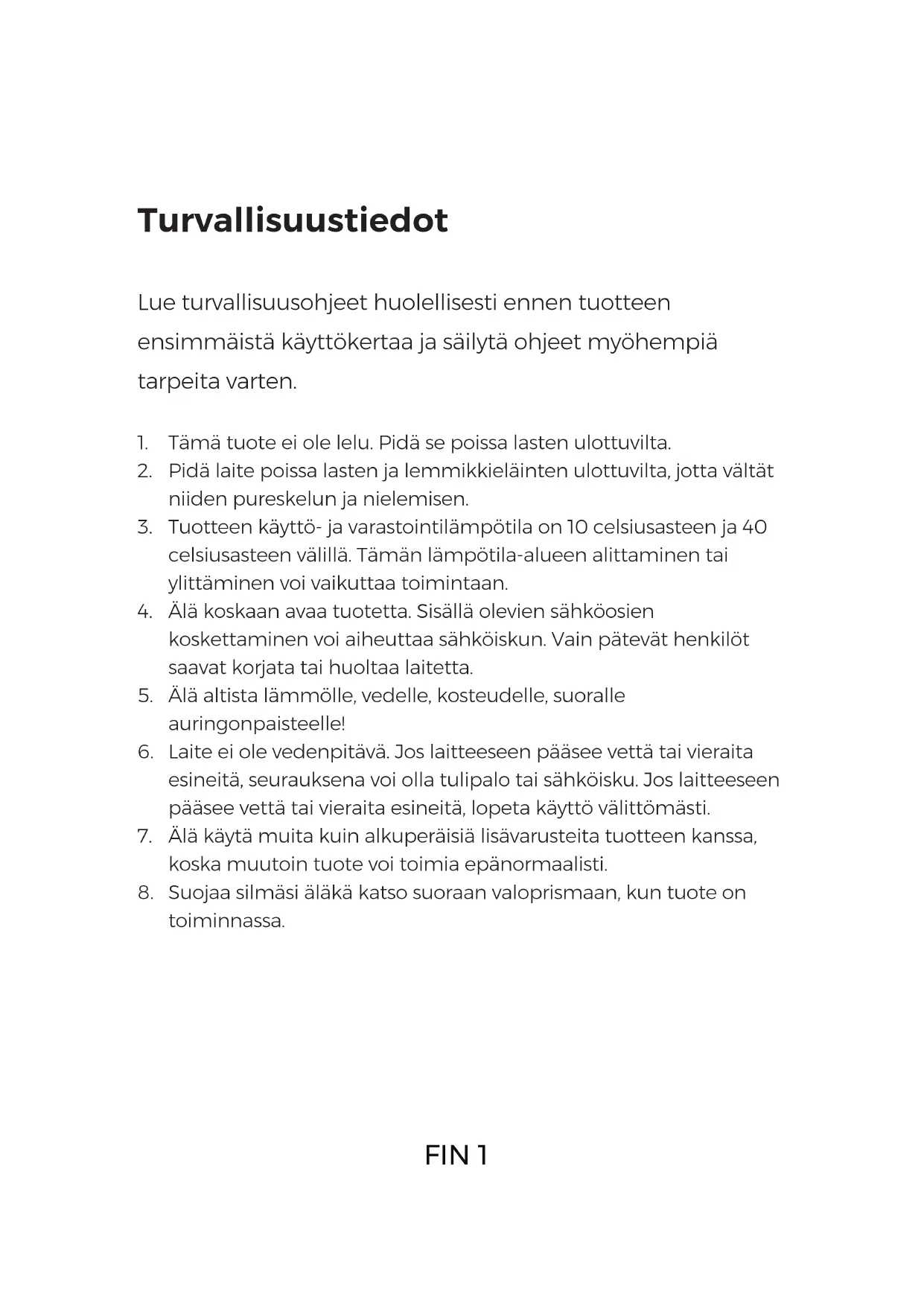 FIN 1 Tämä tuote ei ole lelu. Pidä se poissa lasten ulottuvilta. Pidä laite poissa lasten ja lemmikkieläinten ulottuvilta, jotta vältät niiden pureskelun ja nielemisen. Tuotteen käyttö- ja varastointilämpötila on 10 celsiusasteen ja 40 celsiusasteen välillä. Tämän lämpötila-alueen alittaminen tai ylittäminen voi vaikuttaa toimintaan. Älä koskaan avaa tuotetta. Sisällä olevien sähköosien koskettaminen voi aiheuttaa sähköiskun. Vain pätevät henkilöt saavat korjata tai huoltaa laitetta. Älä altista lämmölle, vedelle, kosteudelle, suoralle auringonpaisteelle! Laite ei ole vedenpitävä. Jos laitteeseen pääsee vettä tai vieraita esineitä, seurauksena voi olla tulipalo tai sähköisku. Jos laitteeseen pääsee vettä tai vieraita esineitä, lopeta käyttö välittömästi. Älä käytä muita kuin alkuperäisiä lisävarusteita tuotteen kanssa, koska muutoin tuote voi toimia epänormaalisti. Suojaa silmäsi äläkä katso suoraan valoprismaan, kun tuote on toiminnassa. Lue turvallisuusohjeet huolellisesti ennen tuotteen ensimmäistä käyttökertaa ja säilytä ohjeet myöhempiä tarpeita varten.Diskovalo kaukosäätimellä