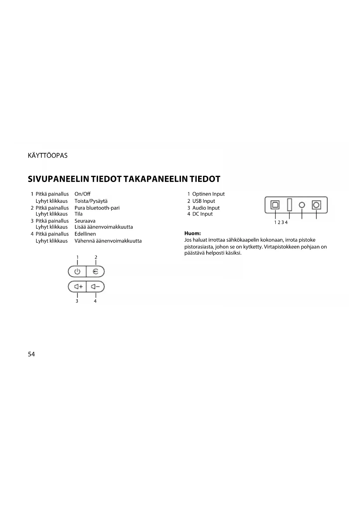 Pitkä painallus Lyhyt klikkaus Pitkä painallus Lyhyt klikkaus Pitkä painallus Lyhyt klikkaus Pitkä painallus Lyhyt klikkaus On/O Toista/Pysäytä Pura bluetooth-pari Tila Seuraava Lisää äänenvoimakkuutta Edellinen Vähennä äänenvoimakkuutta Optinen Input USB Input Audio Input DC Input