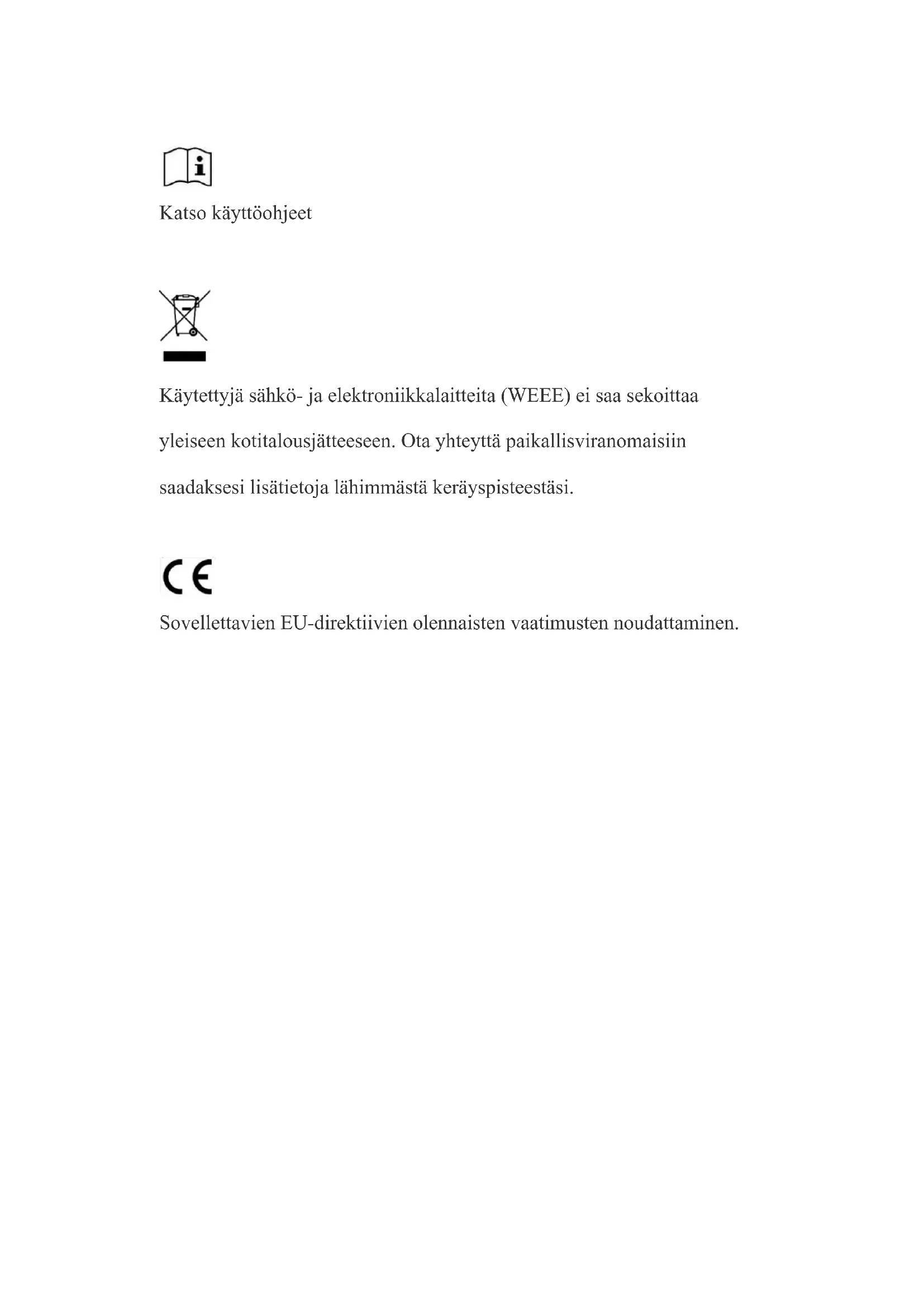 Käytettyjä sähkö- ja elektroniikkalaitteita (WEEE) ei saa sekoittaa yleiseen kotitalousjätteeseen. Ota yhteyttä paikallisviranomaisiin saadaksesi lisätietoja lähimmästä keräyspisteestäsi.