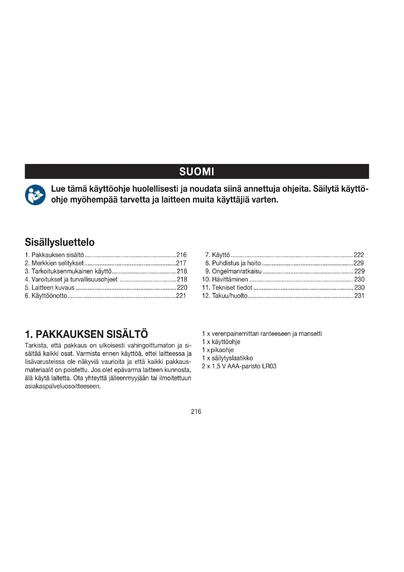 Tarkista, että pakkaus on ulkoisesti vahingoittumaton ja si- sältää kaikki osat. Varmista ennen käyttöä, ettei laitteessa ja lisävarusteissa ole näkyviä vaurioita ja että kaikki pakkaus- materiaalit on poistettu. Jos olet epävarma laitteen kunnosta, älä käytä laitetta. Ota yhteyttä jälleenmyyjään tai ilmoitettuun asiakaspalveluosoitteeseen. 1 x verenpainemittari ranteeseen ja mansetti 1 x käyttöohje 1 x pikaohje 1 x säilytyslaatikko 2 x 1,5 V AAA-paristo LR03217