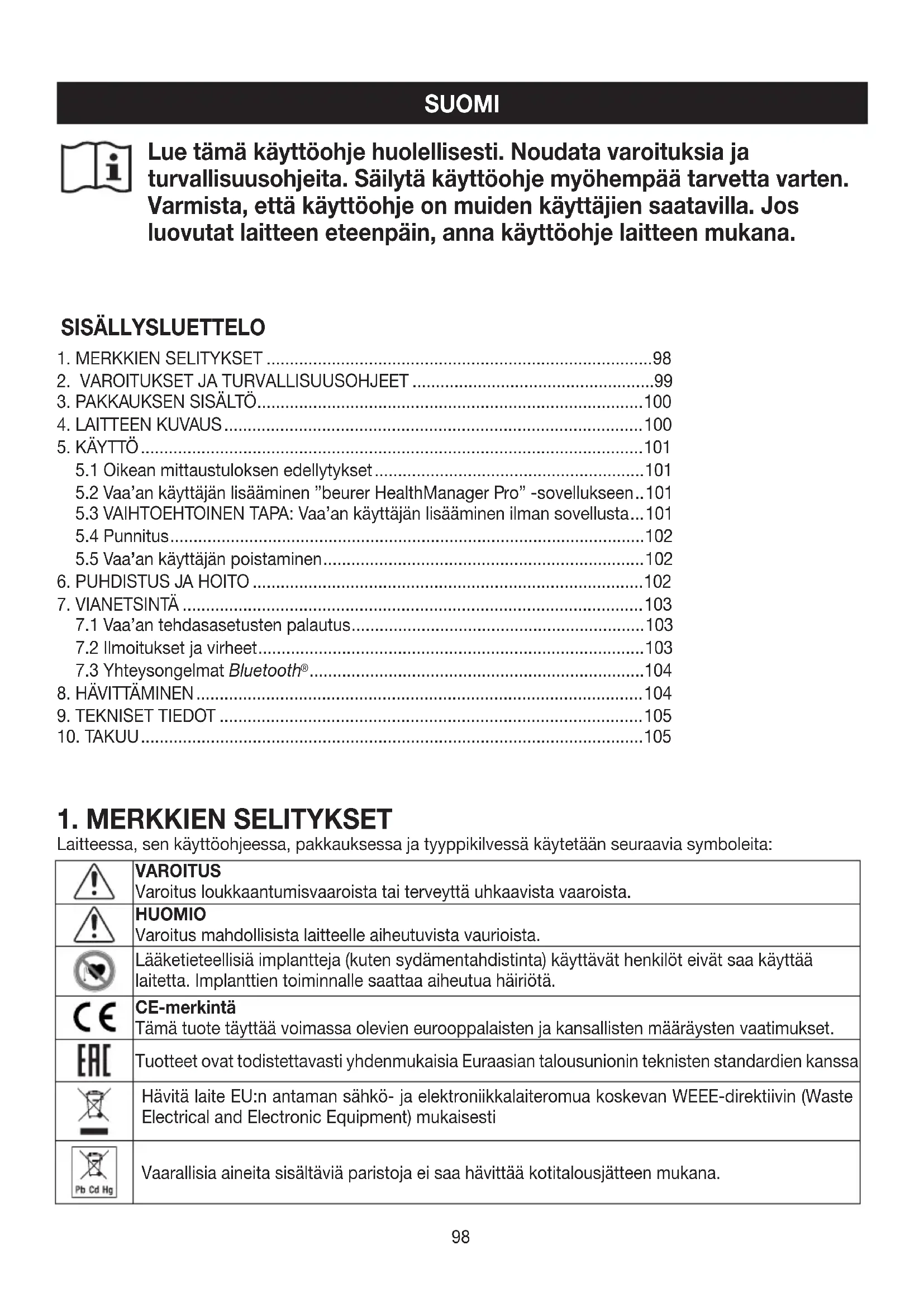 Laitteessa, sen käyttöohjeessa, pakkauksessa ja tyyppikilvessä käytetään seuraavia symboleita: VAROITUS Varoitus loukkaantumisvaaroista tai terveyttä uhkaavista vaaroista. HUOMIO Varoitus mahdollisista laitteelle aiheutuvista vaurioista. Lääketieteellisiä implantteja (kuten sydämentahdistinta) käyttävät henkilöt eivät saa käyttää laitetta. Implanttien toiminnalle saattaa aiheutua häiriötä. CE-merkintä Tämä tuote täyttää voimassa olevien eurooppalaisten ja kansallisten määräysten vaatimukset. Tuotteet ovat todistettavasti yhdenmukaisia Euraasian talousunionin teknisten standardien kanssa Hävitä laite EU:n antaman sähkö- ja elektroniikkalaiteromua koskevan WEEE-direktiivin (Waste Electrical and Electronic Equipment) mukaisesti Vaarallisia aineita sisältäviä paristoja ei saa hävittää kotitalousjätteen mukana.99 United Kingdom Conformity Assessed Mark Valmistaja Irrota pakkauksen osat ja hävitä paikallisten määräysten mukaisesti. Lue käyttöohje