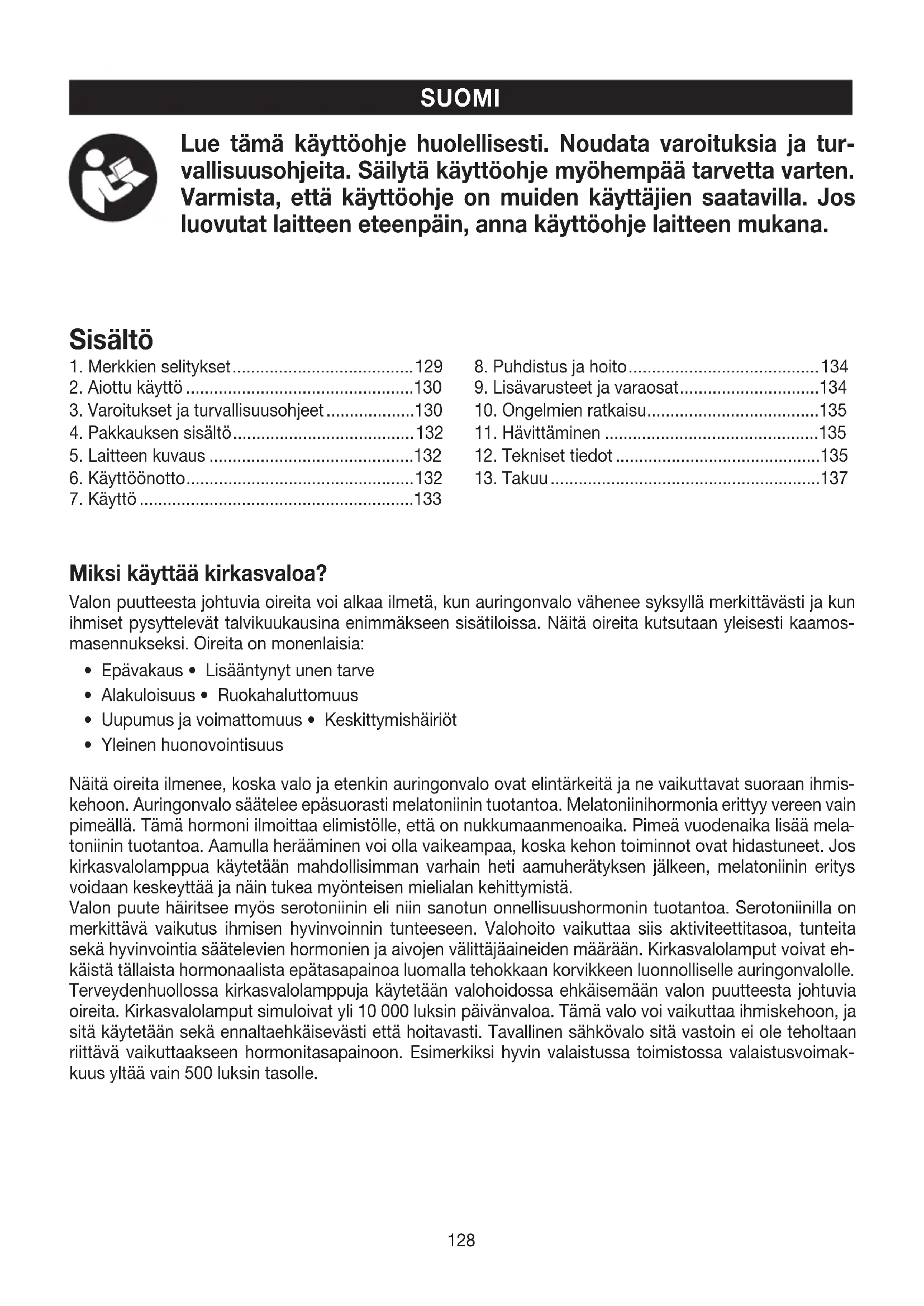 Du finner detaljert informasjon om garantien og garantivilkårene på det medfølgende garantiarket. Informasjon om hendelser For brukere/pasienter i EU og identiske reguleringssystemer (forordning om medisinsk utstyr MDR (EU) 2017/745) gjelder følgende: Hvis det skulle oppstå en alvorlig hendelse under eller på grunn av bruken av produktet, skal dette rapporteres til produsenten og/eller dennes autoriserte representant samt respektive nasjonale myndighet i det landet der brukeren/pasienten befinner seg. Med forbehold om feil og endringer128 SUOMI Lue tämä käyttöohje huolellisesti. Noudata varoituksia ja tur- vallisuusohjeita. Säilytä käyttöohje myöhempää tarvetta varten. Varmista, että käyttöohje on muiden käyttäjien saatavilla. Jos luovutat laitteen eteenpäin, anna käyttöohje laitteen mukana. Miksi käyttää kirkasvaloa? Valon puutteesta johtuvia oireita voi alkaa ilmetä, kun auringonvalo vähenee syksyllä merkittävästi ja kun ihmiset pysyttelevät talvikuukausina enimmäkseen sisätiloissa. Näitä oireita kutsutaan yleisesti kaamos