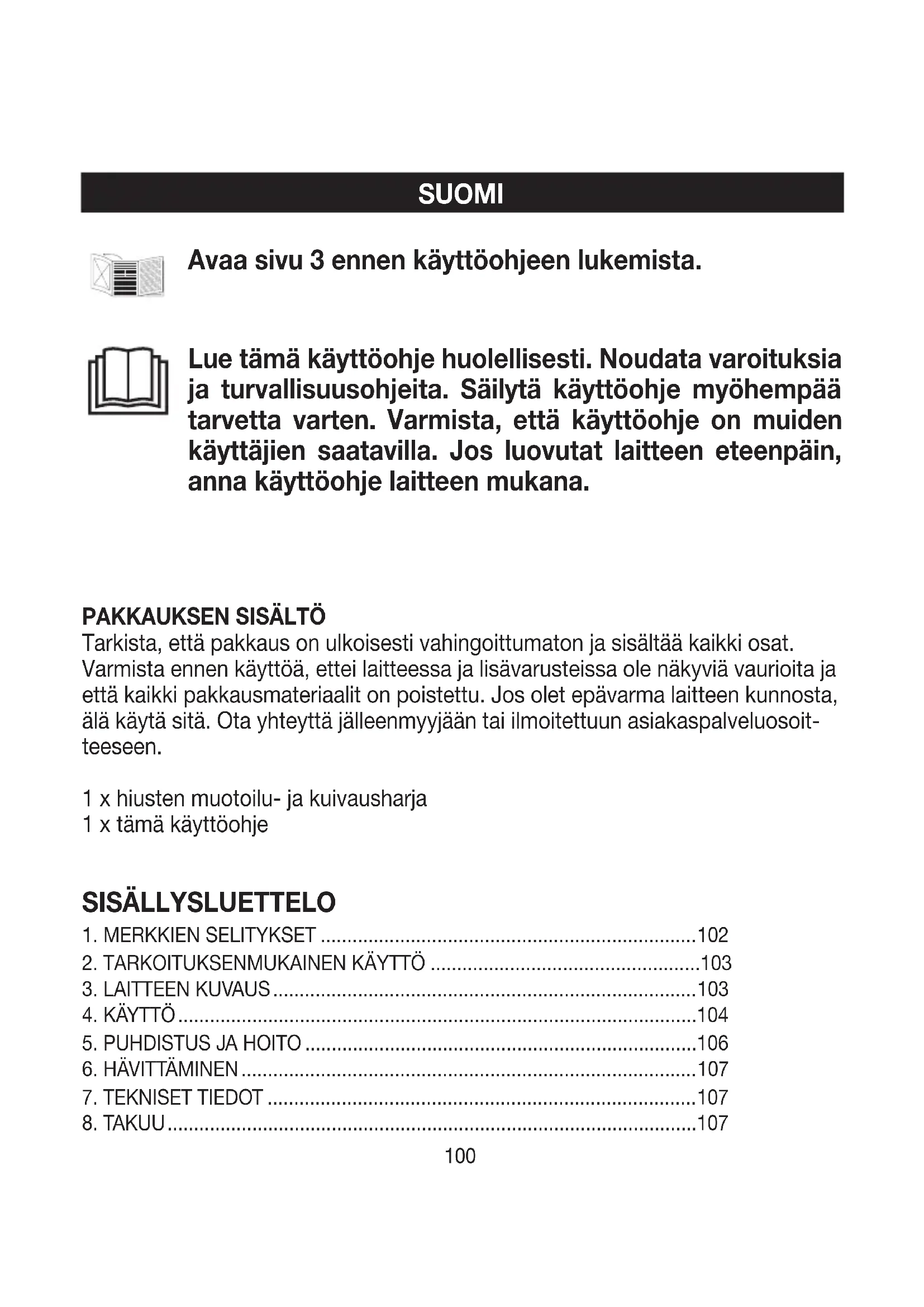 Du finner detaljert informasjon om garantien og garantivilkårene på det medføl- gende garantiarket. Med forbehold om feil og endringer100 SUOMI Lue tämä käyttöohje huolellisesti. Noudata varoituksia ja turvallisuusohjeita. Säilytä käyttöohje myöhempää tarvetta varten. Varmista, että käyttöohje on muiden käyttäjien saatavilla. Jos luovutat laitteen eteenpäin, anna käyttöohje laitteen mukana. Avaa sivu 3 ennen käyttöohjeen lukemista. SISÄLLYSLUETTELO