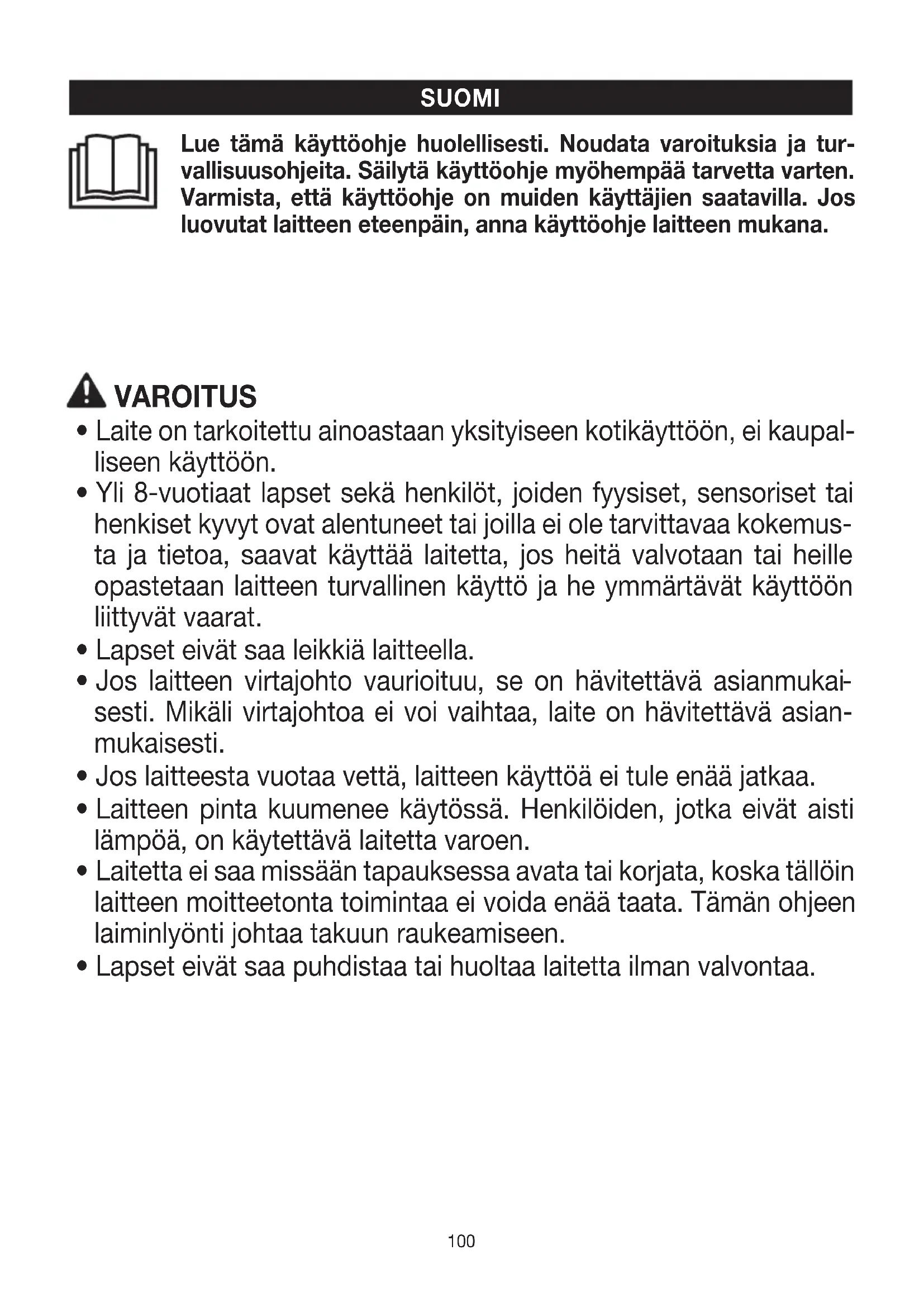 - Lapset eivät saa puhdistaa tai huoltaa laitetta ilman valvontaa.101