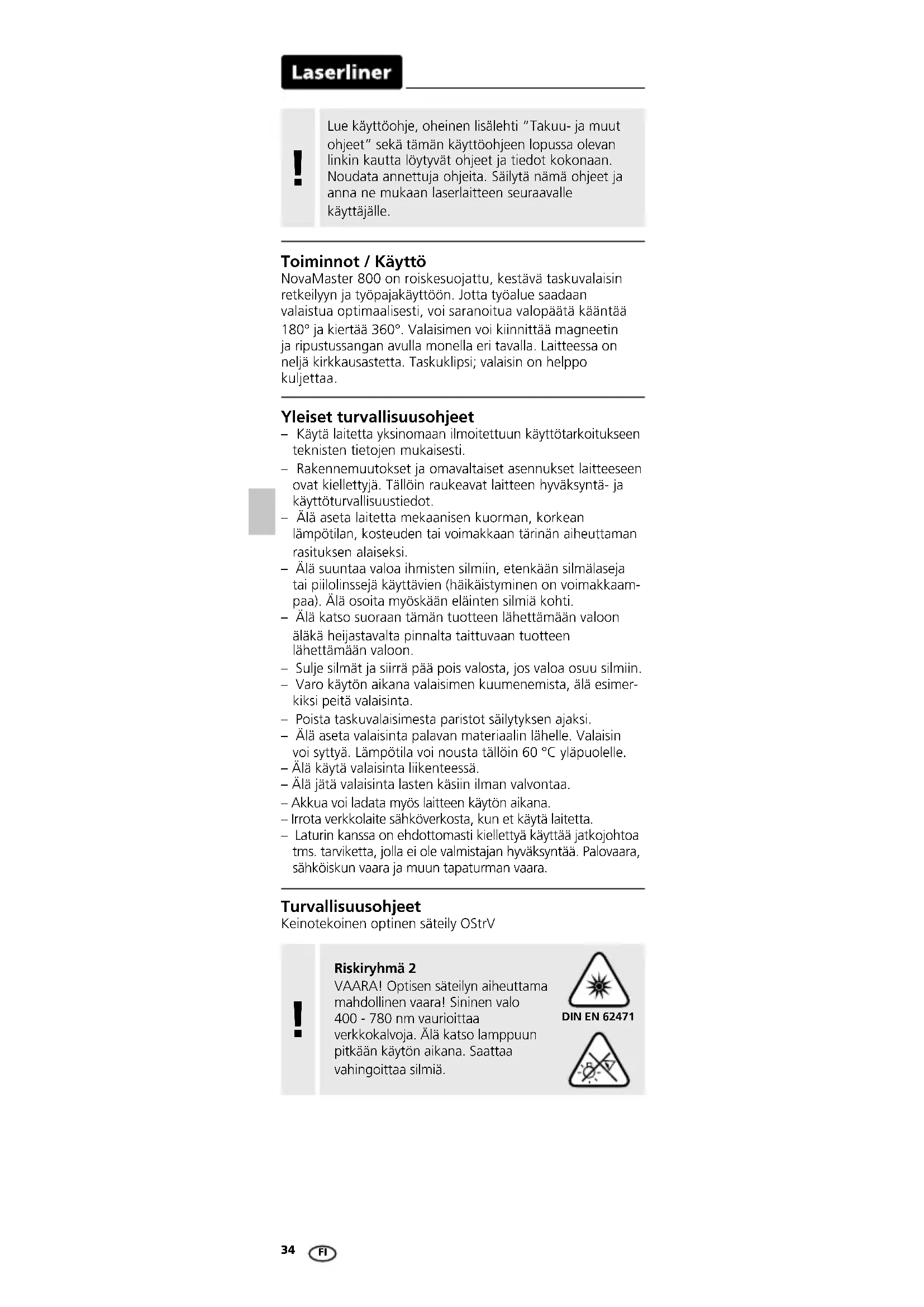 Toiminnot / Käyttö NovaMaster 800 on roiskesuojattu, kestävä taskuvalaisin retkeilyyn ja työpajakäyttöön. Jotta työalue saadaan valaistua optimaalisesti, voi saranoitua valopäätä kääntää 180° ja kiertää 360°. Valaisimen voi kiinnittää magneetin ja ripustussangan avulla monella eri tavalla. Laitteessa on neljä kirkkausastetta. Taskuklipsi; valaisin on helppo kuljettaa. Yleiset turvallisuusohjeet – Käytä laitetta yksinomaan ilmoitettuun käyttötarkoitukseen teknisten tietojen mukaisesti. – Rakennemuutokset ja omavaltaiset asennukset laitteeseen ovat kiellettyjä. Tällöin raukeavat laitteen hyväksyntä- ja käyttöturvallisuustiedot. – Älä aseta laitetta mekaanisen kuorman, korkean lämpötilan, kosteuden tai voimakkaan tärinän aiheuttaman rasituksen alaiseksi. – Älä suuntaa valoa ihmisten silmiin, etenkään silmälaseja tai piilolinssejä käyttävien (häikäistyminen on voimakkaam- paa). Älä osoita myöskään eläinten silmiä kohti. – Älä katso suoraan tämän tuotteen lähettämään valoon äläkä heijastavalta pinnalta taittuvaan tuotteen lähettämään valoon. – Sulje silmät ja siirrä pää pois valosta, jos valoa osuu silmiin. – Varo käytön aikana valaisimen kuumenemista, älä esimer- kiksi peitä valaisinta. – Poista taskuvalaisimesta paristot säilytyksen ajaksi. – Älä aseta valaisinta palavan materiaalin lähelle. Valaisin voi syttyä. Lämpötila voi nousta tällöin 60 °C yläpuolelle. – Älä käytä valaisinta liikenteessä. – Älä jätä valaisinta lasten käsiin ilman valvontaa. – Akkua voi ladata myös laitteen käytön aikana. – Irrota verkkolaite sähköverkosta, kun et käytä laitetta. – Laturin kanssa on ehdottomasti kiellettyä käyttää jatkojohtoa tms. tarviketta, jolla ei ole valmistajan hyväksyntää. Palovaara, sähköiskun vaara ja muun tapaturman vaara. Turvallisuusohjeet Keinotekoinen optinen säteily OStrV Lue käyttöohje, oheinen lisälehti ”Takuu- ja muut ohjeet” sekä tämän käyttöohjeen lopussa olevan linkin kautta löytyvät ohjeet ja tiedot kokonaan. Noudata annettuja ohjeita. Säilytä nämä ohjeet ja anna ne mukaan laserlaitteen seuraavalle käyttäjälle.