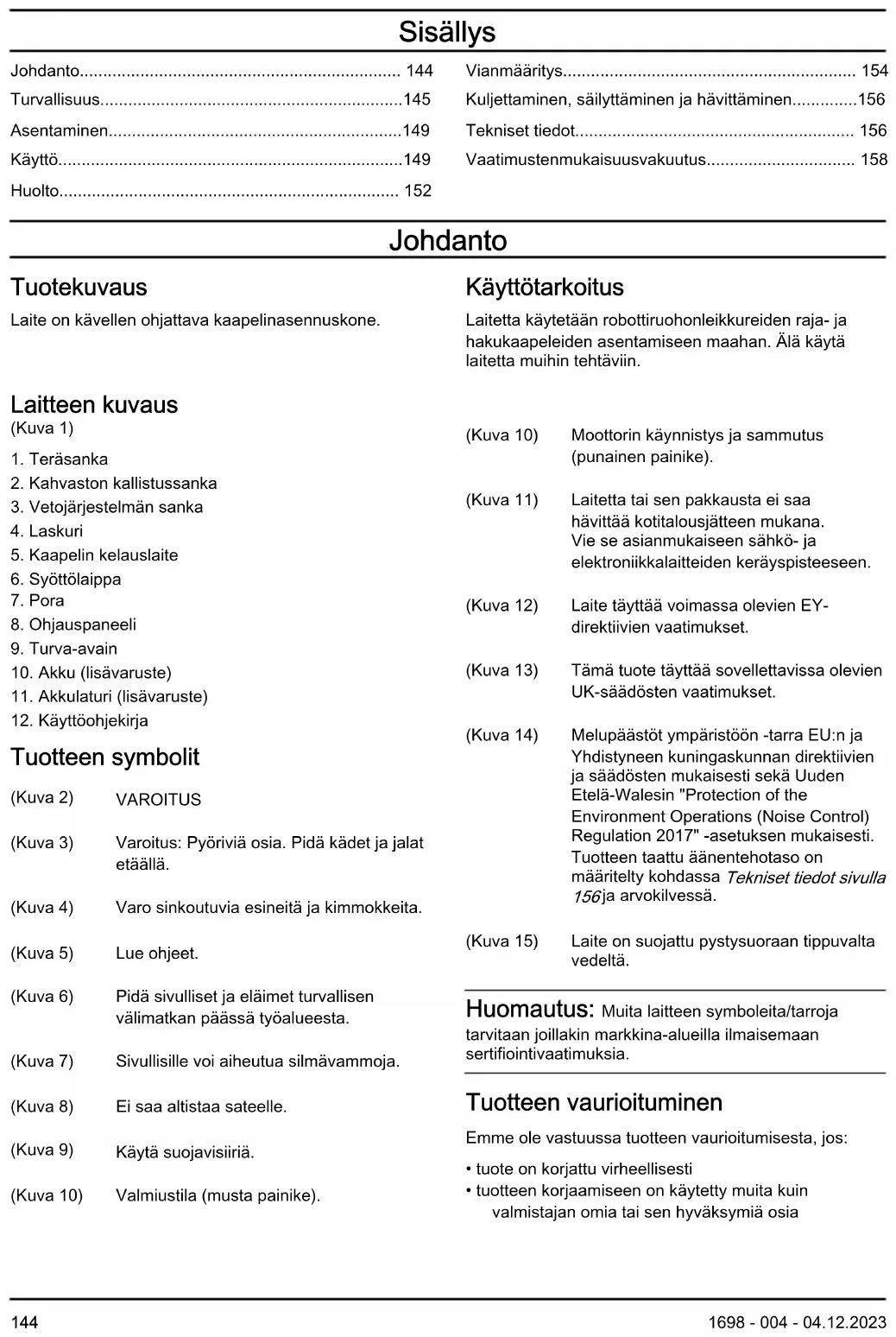 - Vaatimustenmukaisuusvakuutus Johdanto Tuotekuvaus Laite on kävellen ohjattava kaapelinasennuskone. Käyttötarkoitus Laitetta käytetään robottiruohonleikkureiden raja- ja hakukaapeleiden asentamiseen maahan. Älä käytä laitetta muihin tehtäviin. Laitteen kuvaus (Kuva 1) p. 158