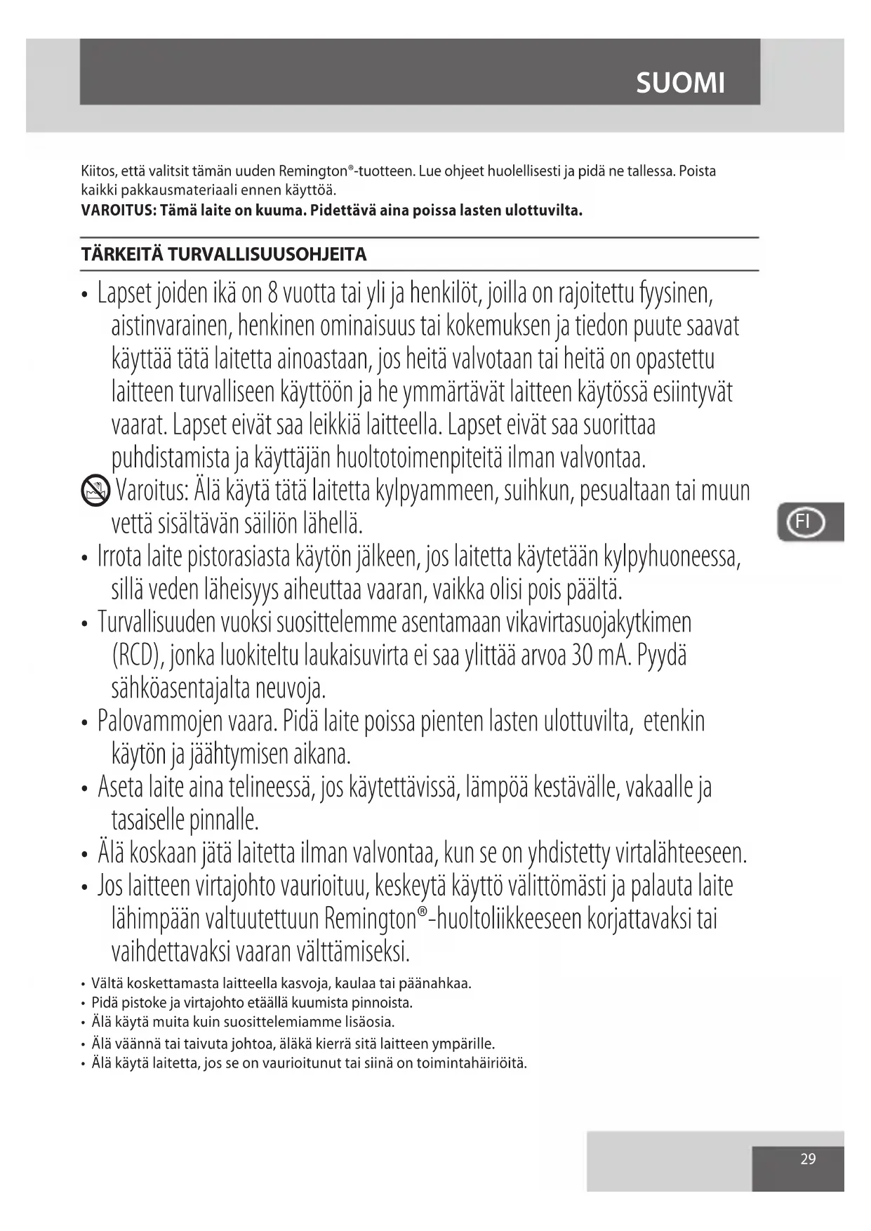 - Jos laitteen virtajohto vaurioituu, keskeytä käyttö välittömästi ja palauta laite lähimpään valtuutettuun Remington®-huoltoliikkeeseen korjattavaksi tai vaihdettavaksi vaaran välttämiseksi.
