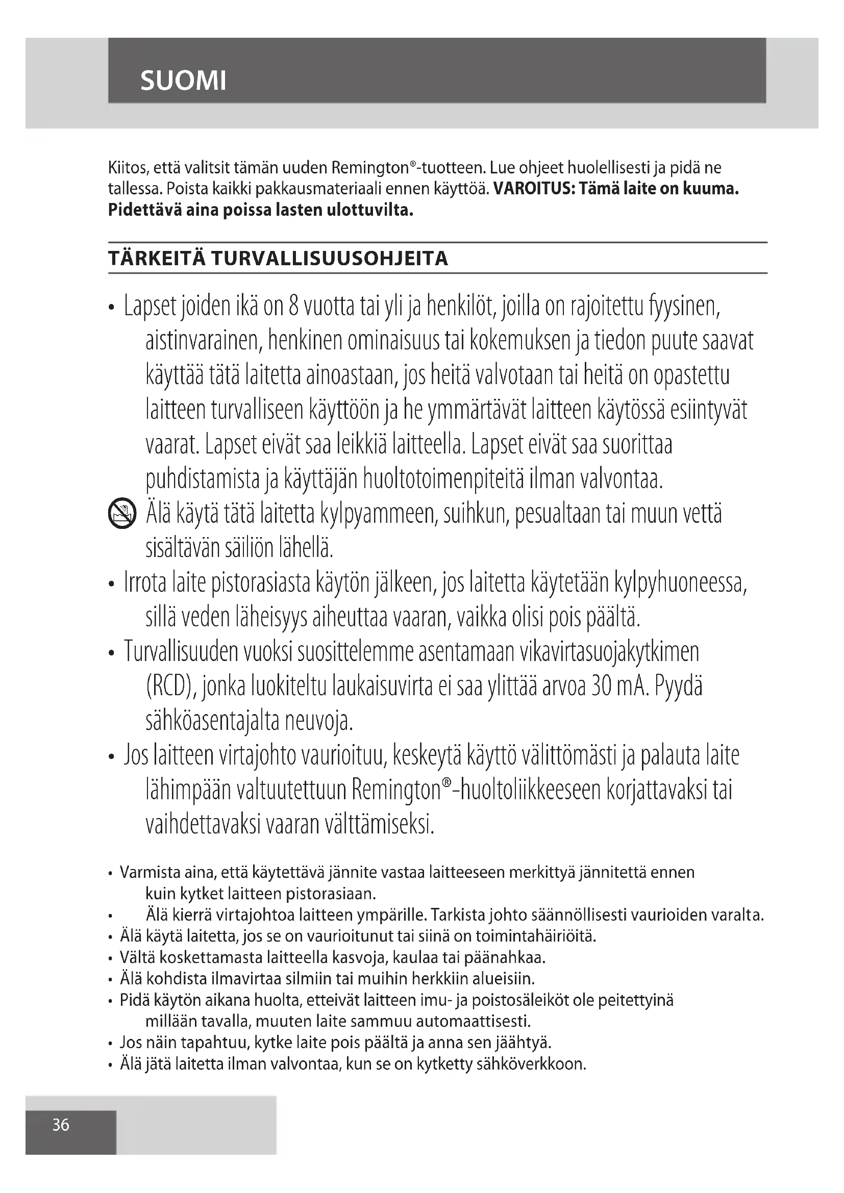 AE36 Kiitos, että valitsit tämän uuden Remington®-tuotteen. Lue ohjeet huolellisesti ja pidä ne tallessa. Poista kaikki pakkausmateriaali ennen käyttöä. VAROITUS: Tämä laite on kuuma. Pidettävä aina poissa lasten ulottuvilta.