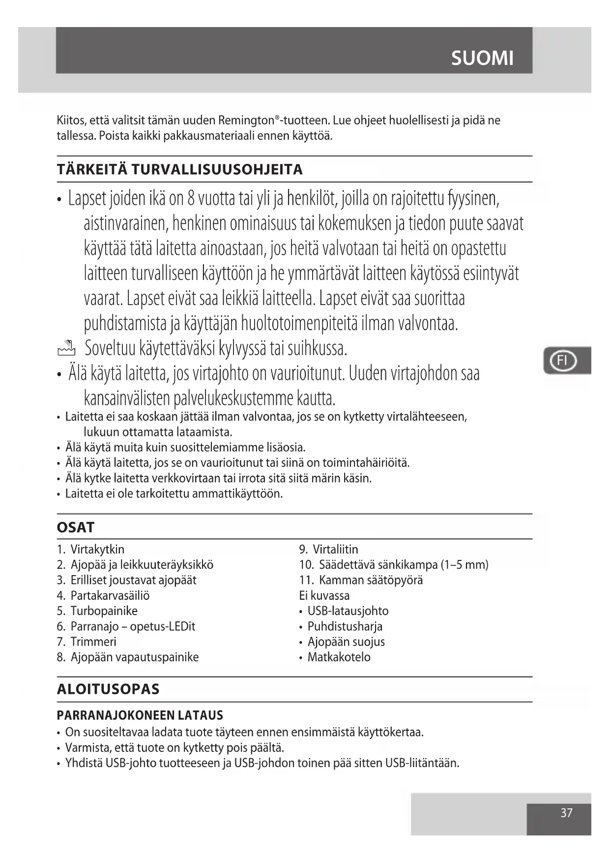 - Laitetta ei saa koskaan jättää ilman valvontaa, jos se on kytketty virtalähteeseen, lukuun ottamatta lataamista.• Älä käytä muita kuin suosittelemiamme lisäosia.• Älä käytä laitetta, jos se on vaurioitunut tai siinä on toimintahäiriöitä.• Älä kytke laitetta verkkovirtaan tai irrota sitä siitä märin käsin.• Laitetta ei ole tarkoitettu ammattikäyttöön. OSAT 1. Virtakytkin2. Ajopää ja leikkuuteräyksikkö3. Erilliset joustavat ajopäät4. Partakarvasäiliö5. Turbopainike6. Parranajo – opetus-LEDit7. Trimmeri8. Ajopään vapautuspainike9. Virtaliitin10. Säädettävä sänkikampa (1–5 mm)11. Kamman säätöpyöräEi kuvassa• USB-latausjohto• Puhdistusharja • Ajopään suojus• Matkakotelo ALOITUSOPAS PARRANAJOKONEEN LATAUS• On suositeltavaa ladata tuote täyteen ennen ensimmäistä käyttökertaa.• Varmista, että tuote on kytketty pois päältä.• Yhdistä USB-johto tuotteeseen ja USB-johdon toinen pää sitten USB-liitäntään.