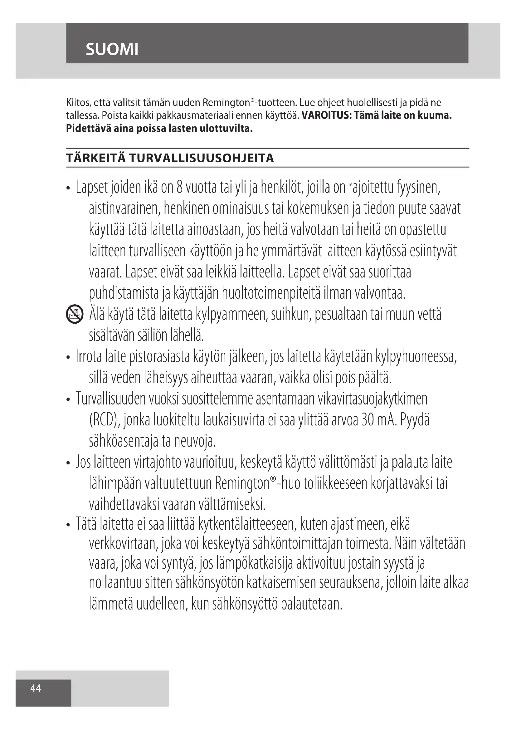 AE44 SUOMI Kiitos, että valitsit tämän uuden Remington®-tuotteen. Lue ohjeet huolellisesti ja pidä ne tallessa. Poista kaikki pakkausmateriaali ennen käyttöä. VAROITUS: Tämä laite on kuuma. Pidettävä aina poissa lasten ulottuvilta.