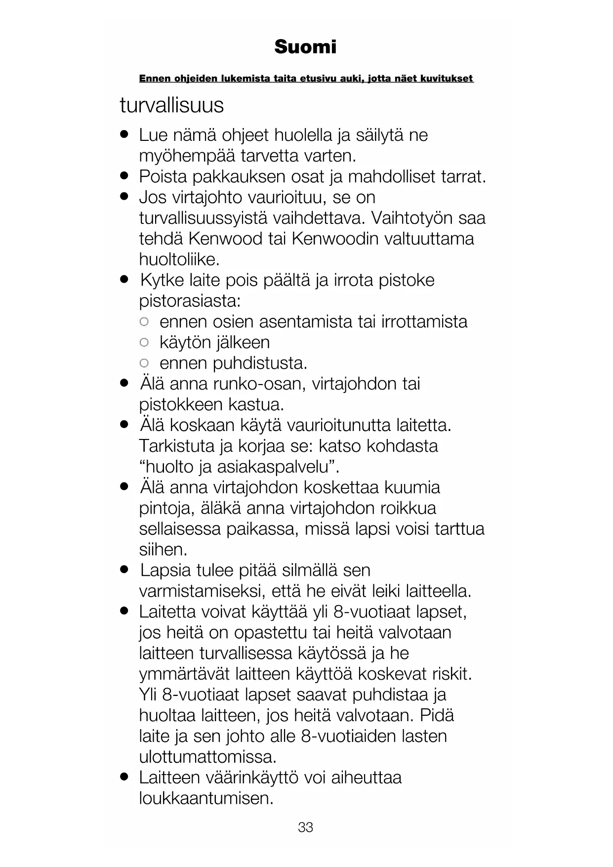 Laitteen väärinkäyttö voi aiheuttaa loukkaantumisen. Ennen ohjeiden lukemista taita etusivu auki, jotta näet kuvitukset Suomi33 34