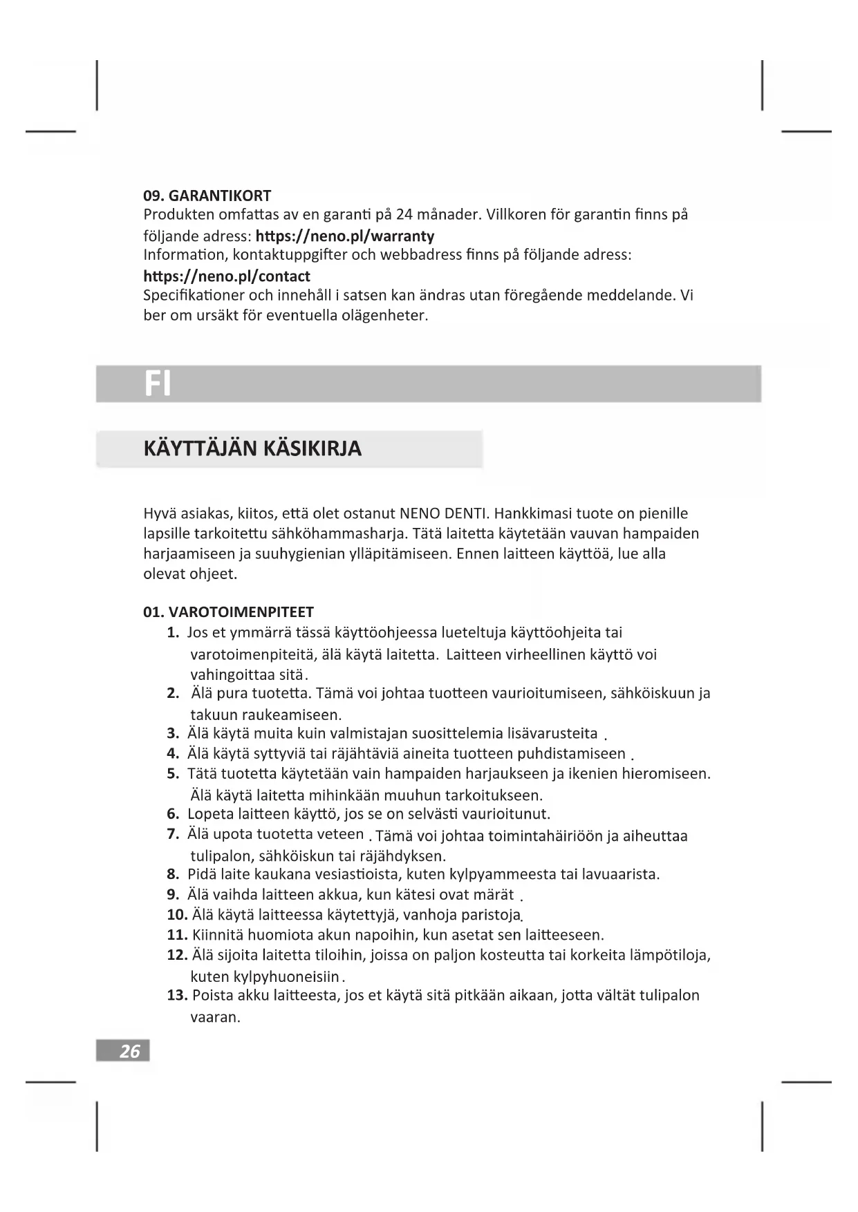 Hyvä asiakas, kiitos, eä olet ostanut NENO DENTI. Hankkimasi tuote on pienille lapsille tarkoiteu sähköhammasharja. Tätä laitea käytetään vauvan hampaiden harjaamiseen ja suuhygienian ylläpitämiseen. Ennen laieen käyöä, lue alla olevat ohjeet.