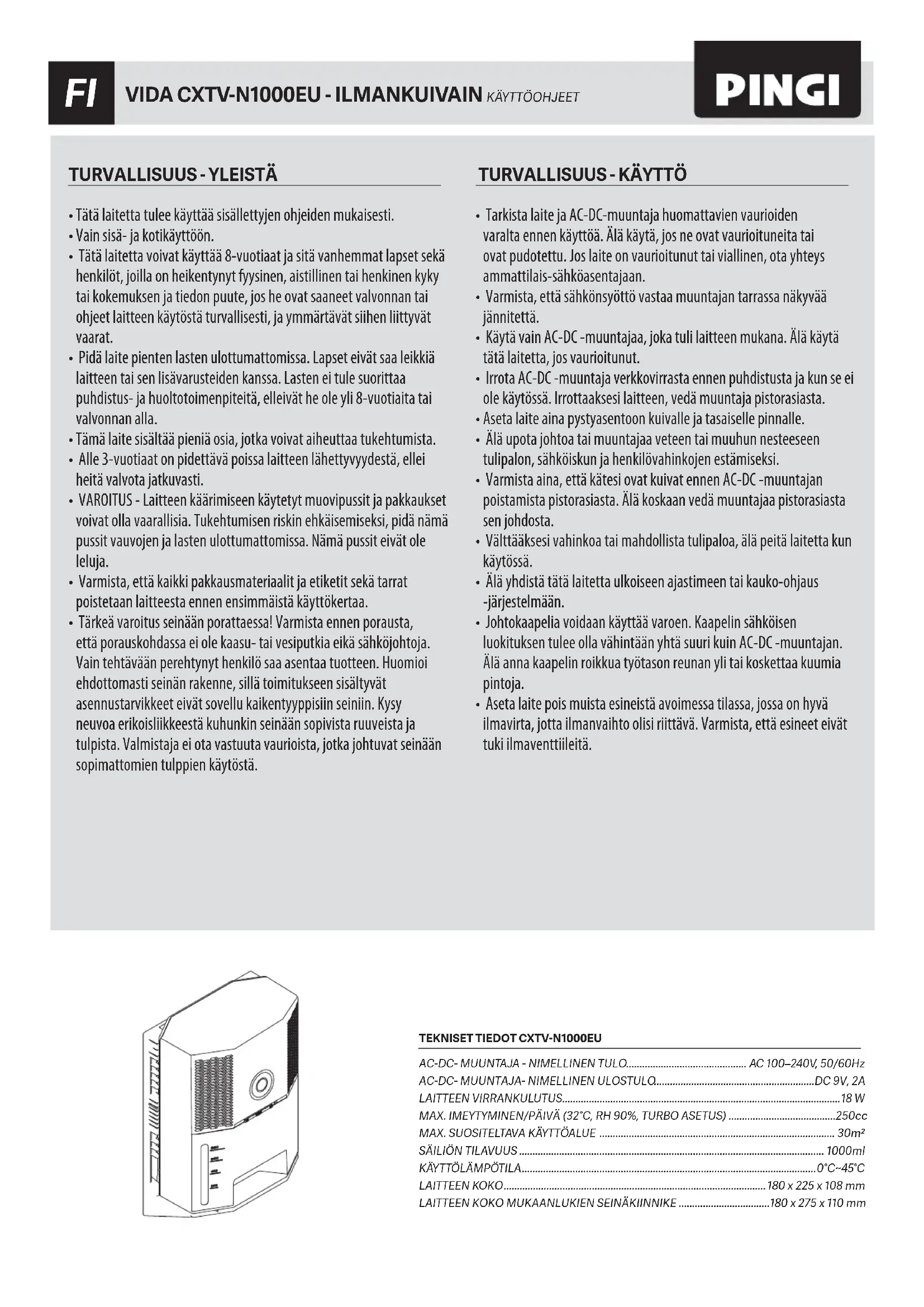 CXTV-N1000EU - VIDA FI (2020)_v2.indd 3 06-11-20(W45) 16:10KÄYTTÖTARKOITUSPingi Vida -ilmankuivain (CXTV-N1000EU) soveltuu suljettujen sisätilojen kuivattamiseen. Laitteen virtalähteenä toimii 9V AC-DC -muuntaja, joka tulee laitteen mukana. Muuntaja toimii 100-240V, 50/60Hz (sähköverkolla). Älä koskaan koeta liittää laitetta tai muuntajaa muihin virtalähteisiin. Seuraa aina tämän käyttöohjeen turvallisuusohjeita. Säilytä tätä käyttöohjetta turvallisessa paikassa, joka on aina saatavilla. Tämä tuote täyttää lainsäädännölliset, kansalliset ja eurooppalaiset vaatimukset. Älä koskaan koeta tehdä teknisiä muutoksia tähän laitteeseen. Emme ota vastuuta onnettomuuksista tai vahingoista, jotka johtuvat näiden käyttö- ja turvallisuusohjeiden noudattamatta jättämisestä.TOIMINTA JA KÄYTTÖTARKOITUS Pingi Vida 2 ilmankuivain (CXTV-N1000EU) kehitettiin pienikokoiseksi ilmankuivaimeksi, jolla voit kerätä ylimääräisen kosteuden sisätiloista. Tämä tuote on ihanteellinen tuulettamattomiin sisätiloihin. Ilman ylimääräinen kosteus kerääntyy laitteeseen integroituun vesisäiliöön. MITÄ ODOTTAAVida 2 on lämpösähköinen ilmankuivain. Tämän tyyppisen ilmankuivaimen toiminta riippuu ilmassa olevan kosteuden määrästä. Mitä korkeampi lämpötila, sitä enemmän ilmassa on kosteutta (ilma suhteellinen kosteus). Korkeissa lämpötiloissa laitteen on toimittava korkeammalla tehokkuudella sillä sen on poistettava enemmän kosteutta suhteellisen kosteuden alentamiseksi. Vida 2 pystyy keräämään enintään 250 ml vettä päivässä, ja saatat joutua tyhjentämään vesisäiliön usein. Kylmemmissä tiloissa on vähemmän kosteutta kerättäväksi, ja näin ollen vesisäiliö täyttyy hitaammin. Onko huoneesi lämpötila matalampi kuin 10°C? Ilmassa on tällöin huomattavasti vähemmän kosteutta ja vesisäiliö täyttyy erittäin hitaasti. ENNEN KUIN ALOITATLue turvallisuusohjeet tämän käyttöohjeen etusivulla ennen aloittamista. SEINÄTELINEEN ASENNUSTähän sarjaan kuuluu seinäteline, malli VSB-1S. Seinätelineen käyttö on valinnaista - laitetta voidaan käyttää myös ilman sitä.Jotta seinätelinettä voitaisiin käyttää turvallisesti, telineen on oltava turvallisesti asennettu pystysuoralle pinnalle kolmella ruuvilla.1. Valitse pystysuora pinta, joka tarjoaa riittävän etäisyyden seinätelineeseen ja muihin kohteisiin.