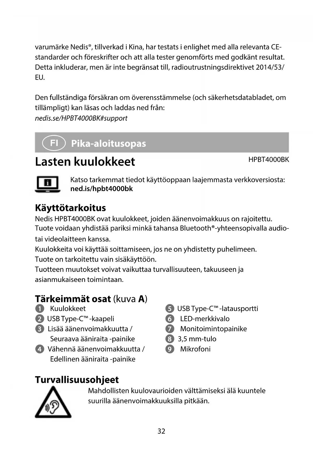 Pika-aloitusopas Lasten kuulokkeet HPBT4000BK Katso tarkemmat tiedot käyttöoppaan laajemmasta verkkoversiosta: ned.is/hpbt4000bk Käyttötarkoitus Nedis HPBT4000BK ovat kuulokkeet, joiden äänenvoimakkuus on rajoitettu. Tuote voidaan yhdistää pariksi minkä tahansa Bluetooth®-yhteensopivalla audio- tai videolaitteen kanssa. Kuulokkeita voi käyttää soittamiseen, jos ne on yhdistetty puhelimeen. Tuote on tarkoitettu vain sisäkäyttöön. Tuotteen muutokset voivat vaikuttaa turvallisuuteen, takuuseen ja asianmukaiseen toimintaan. Tärkeimmät osat (kuva A) 1 Kuulokkeet 2 USB Type-C™ -kaapeli 3 Lisää äänenvoimakkuutta / Seuraava ääniraita -painike 4 Vähennä äänenvoimakkuutta / Edellinen ääniraita -painike 5 USB Type-C™ -latausportti 6 LED-merkkivalo 7 Monitoimintopainike 8 3,5 mm-tulo 9 Mikrofoni Turvallisuusohjeet Mahdollisten kuulovaurioiden välttämiseksi älä kuuntele suurilla äänenvoimakkuuksilla pitkään.33
