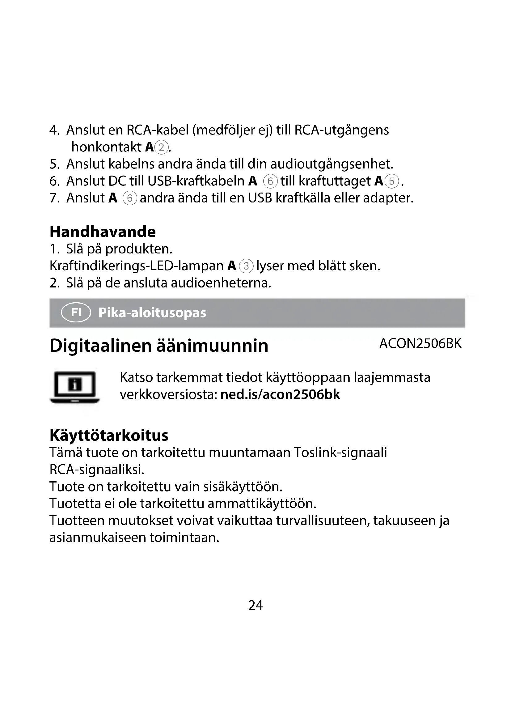 Pika-aloitusopas Digitaalinen äänimuunnin ACON2506BK Katso tarkemmat tiedot käyttöoppaan laajemmasta verkkoversiosta: ned.is/acon2506bk Käyttötarkoitus Tämä tuote on tarkoitettu muuntamaan Toslink-signaali RCA-signaaliksi. Tuote on tarkoitettu vain sisäkäyttöön. Tuotetta ei ole tarkoitettu ammattikäyttöön. Tuotteen muutokset voivat vaikuttaa turvallisuuteen, takuuseen ja asianmukaiseen toimintaan.25 Tekniset tiedot Tuote Digitaalinen äänimuunnin Tuotenro ACON2506BK Ottoteho 5,0 VDC ; 0,6 A Muunto Toslink RCA:ksi Tuetut formaatit DTS, DTS5.1, Dolby Digital, Dolby Digital 5.1, PMC, AAC, MPEG-2 Tuetut bittinopeudet 44,1 kHz 24-bittinen 48 kHz 24-bittinen 96 kHz 24-bittinen Tärkeimmät osat (kuva A)