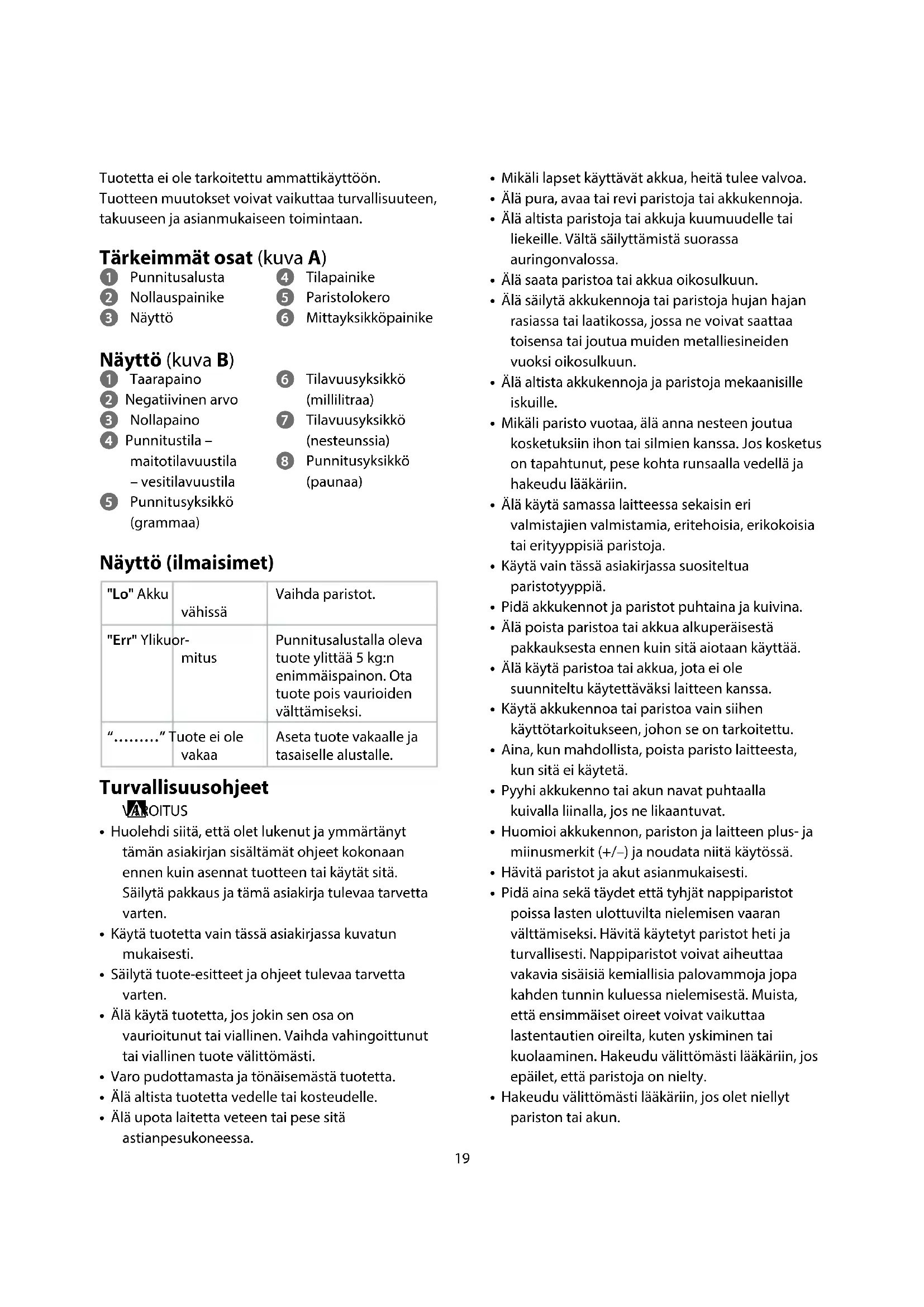 - Hakeudu välittömästi lääkäriin, jos olet niellyt pariston tai akun. Tuotetta ei ole tarkoitettu ammattikäyttöön. Tuotteen muutokset voivat vaikuttaa turvallisuuteen, takuuseen ja asianmukaiseen toimintaan. Tärkeimmät osat (kuva A) 1 Punnitusalusta 2 Nollauspainike 3 Näyttö 4 Tilapainike 5 Paristolokero 6 Mittayksikköpainike Näyttö (kuva B) 1 Taarapaino 2 Negatiivinen arvo 3 Nollapaino 4 Punnitustila – maitotilavuustila – vesitilavuustila 5 Punnitusyksikkö (grammaa) 6 Tilavuusyksikkö (millilitraa) 7 Tilavuusyksikkö (nesteunssia) 8 Punnitusyksikkö (paunaa) Näyttö (ilmaisimet) "Lo" Akku vähissä Vaihda paristot. "Err" Ylikuor- mitus Punnitusalustalla oleva tuote ylittää 5 kg:n enimmäispainon. Ota tuote pois vaurioiden välttämiseksi. “………” Tuote ei ole vakaa Aseta tuote vakaalle ja tasaiselle alustalle. Turvallisuusohjeet