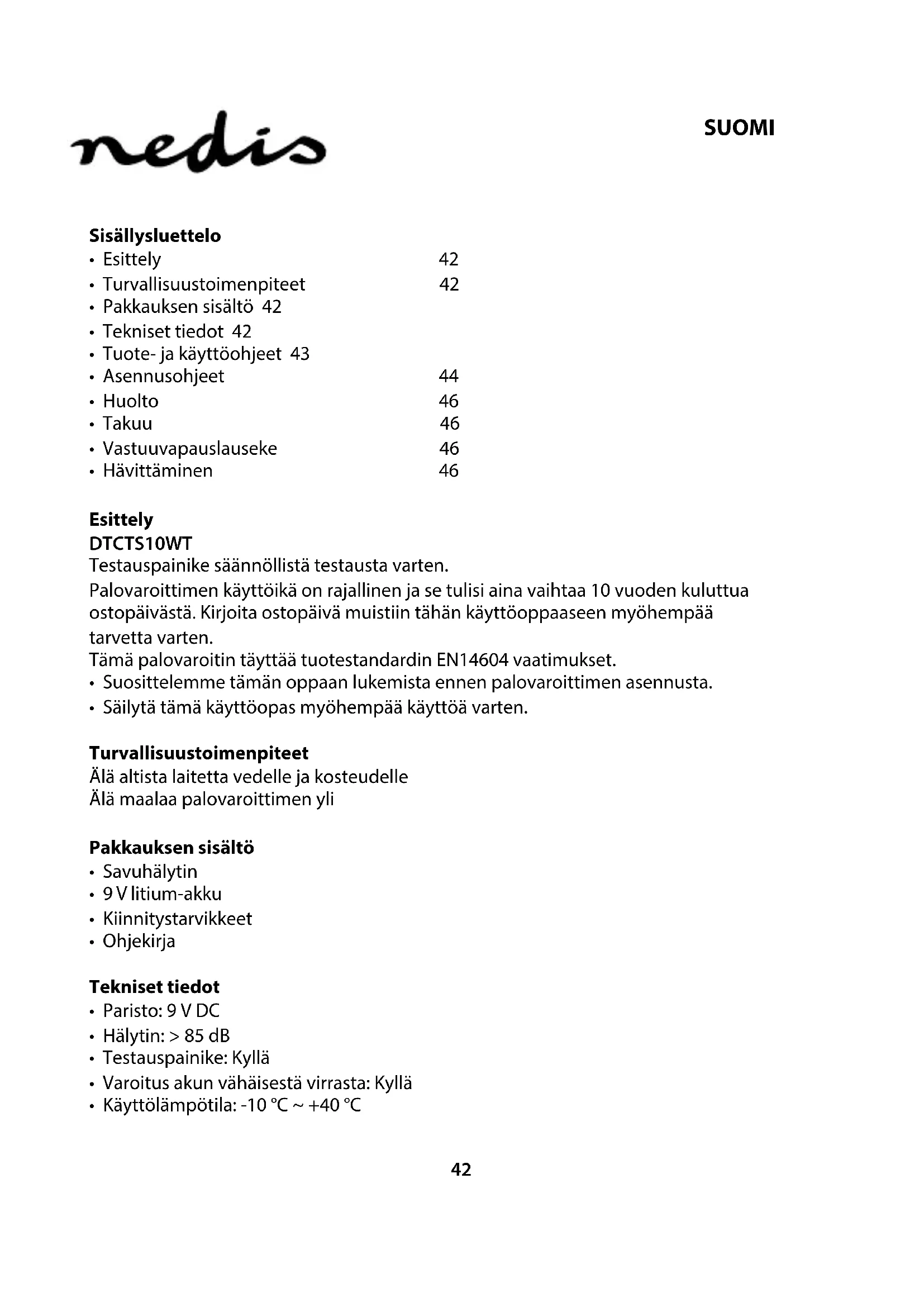 Huolto Suosittelemme varoittimen puhdistusta kuukausittain. Imuroi varoitin varovasti ulkopuolelta imurin harjasuuttimella. Älä käytä vettä, pesuaineita tai hankaavia materiaaleja. Takuu Takuu ja vastuuvelvollisuus mitätöityvät, jos tuote vaurioituu siihen tehtyjen muutoksien tai sen väärinkäytön takia. Vastuuvapauslauseke Muutoksia malliin ja teknisiin ominaisuuksiin voidaan tehdä ilmoituksetta. Kaikki logot, merkit ja tuotenimet ovat niiden vastaavien omistajien tuotemerkkejä tai rekisteröityjä tuotemerkkejä ja niitä on käsiteltävä sellaisina. Hävittäminen