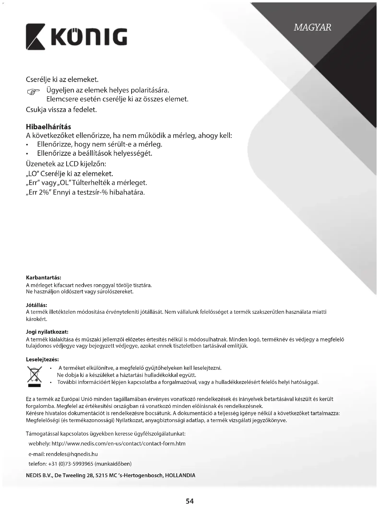 - Varmista, että näytön asetukset ovat oikein. LCD-ruutu näyttää: ”LO” Asenna uudet paristot. ”Err”/”OL” Maksimipaino on ylitetty. ”Err 2%” Osoittaa virhemarginaalin rasvaprosentin suhteen. Huolto: Pyyhi vaaka nihkeällä liinalla. Älä käytä liuottimia tai hankausaineita. Takuu: Takuu mitätöityy, mikäli laitteeseen tehdään mitä tahansa muutoksia. Emme ole myöskään vastuussa vahingoista, jotka johtuvat tämän tuotteen virheellisestä käytöstä. Vastuuvapauslauseke: Muutoksia malliin ja teknisiin ominaisuuksiin voidaan tehdä ilmoituksetta. Kaikki logot, merkit ja tuotenimet ovat niiden vastaavien omistajien tuotemerkkejä tai rekisteröityjä tuotemerkkejä ja niitä on käsiteltävä sellaisina. Hävittäminen: