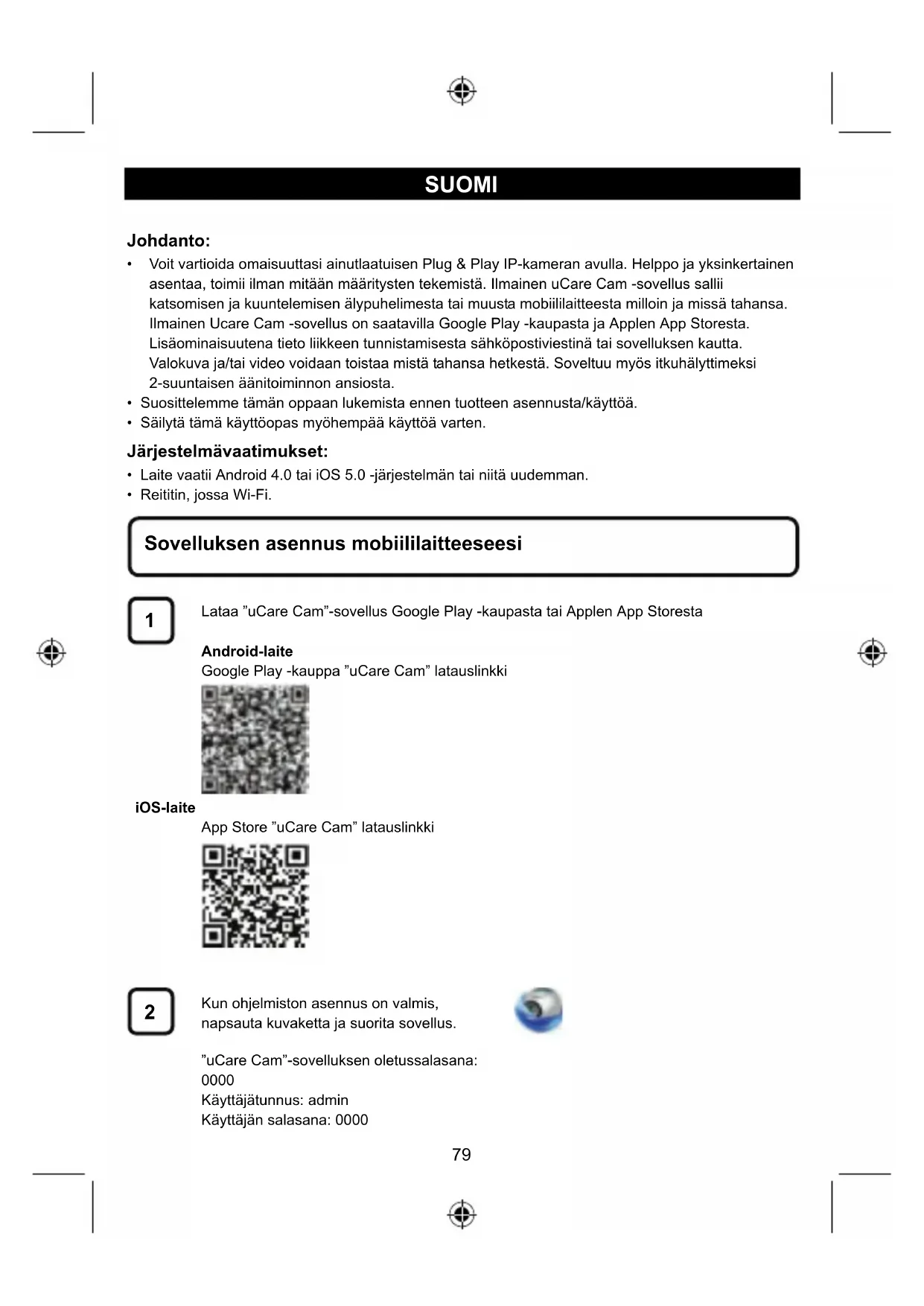 Lataa ”uCare Cam”-sovellus Google Play -kaupasta tai Applen App Storesta Android-laite Google Play -kauppa ”uCare Cam” latauslinkki iOS-laite App Store ”uCare Cam” latauslinkki