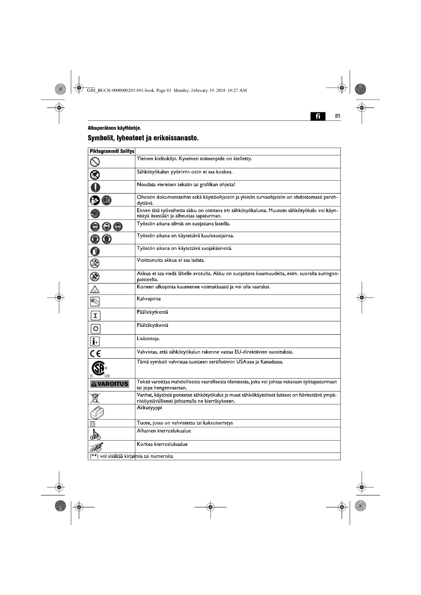 Alkuperäinen käyttöohje. Symbolit, lyhenteet ja erikoissanasto. Piktogrammit Selitys Yleinen kieltokilpi. Kyseinen toimenpide on kielletty. Sähkötyökalun pyöriviin osiin ei saa koskea. Noudata viereisen tekstin tai grafiikan ohjeita! Oheisiin dokumentteihin sekä käyttöohjeisiin ja yleisiin turvaohjeisiin on ehdottomasti pereh- dyttävä. Ennen tätä työvaihetta akku on otettava irti sähkötyökalusta. Muutoin sähkötyökalu voi käyn- nistyä itsestään ja aiheuttaa tapaturman. Työstön aikana silmät on suojattava laseilla. Työstön aikana on käytettävä kuulosuojainta. Työstön aikana on käytettävä suojakäsineitä. Vioittunutta akkua ei saa ladata. Akkua ei saa viedä lähelle avotulta. Akku on suojattava kuumuudelta, esim. suoralta auringon- paisteelta. Koneen ulkopinta kuumenee voimakkaasti ja voi olla vaaraksi. Kahvapinta Päällekytkentä Päältäkytkentä Lisätietoja. Vahvistaa, että sähkötyökalun rakenne vastaa EU-direktiivien suosituksia. Tämä symboli vahvistaa tuotteen sertifioinnin USA:ssa ja Kanadassa. Teksti varoittaa mahdollisesta vaarallisesta tilanteesta, joka voi johtaa vakavaan työtapaturmaan tai jopa hengenvaaraan. Vanhat, käytöstä poistetut sähkötyökalut ja muut sähkökäyttöiset laitteet on hävitettävä ympä- ristöystävällisesti johtamalla ne kierrätykseen. Akkutyyppi Tuote, jossa on vahvistettu tai kaksoiseristys Alhainen kierroslukualue Korkea kierroslukualue (**) voi sisältää kirjaimia tai numeroita OBJ_BUCH-0000000285-001.book Page 85 Monday, February 19, 2018 10:27 AM86