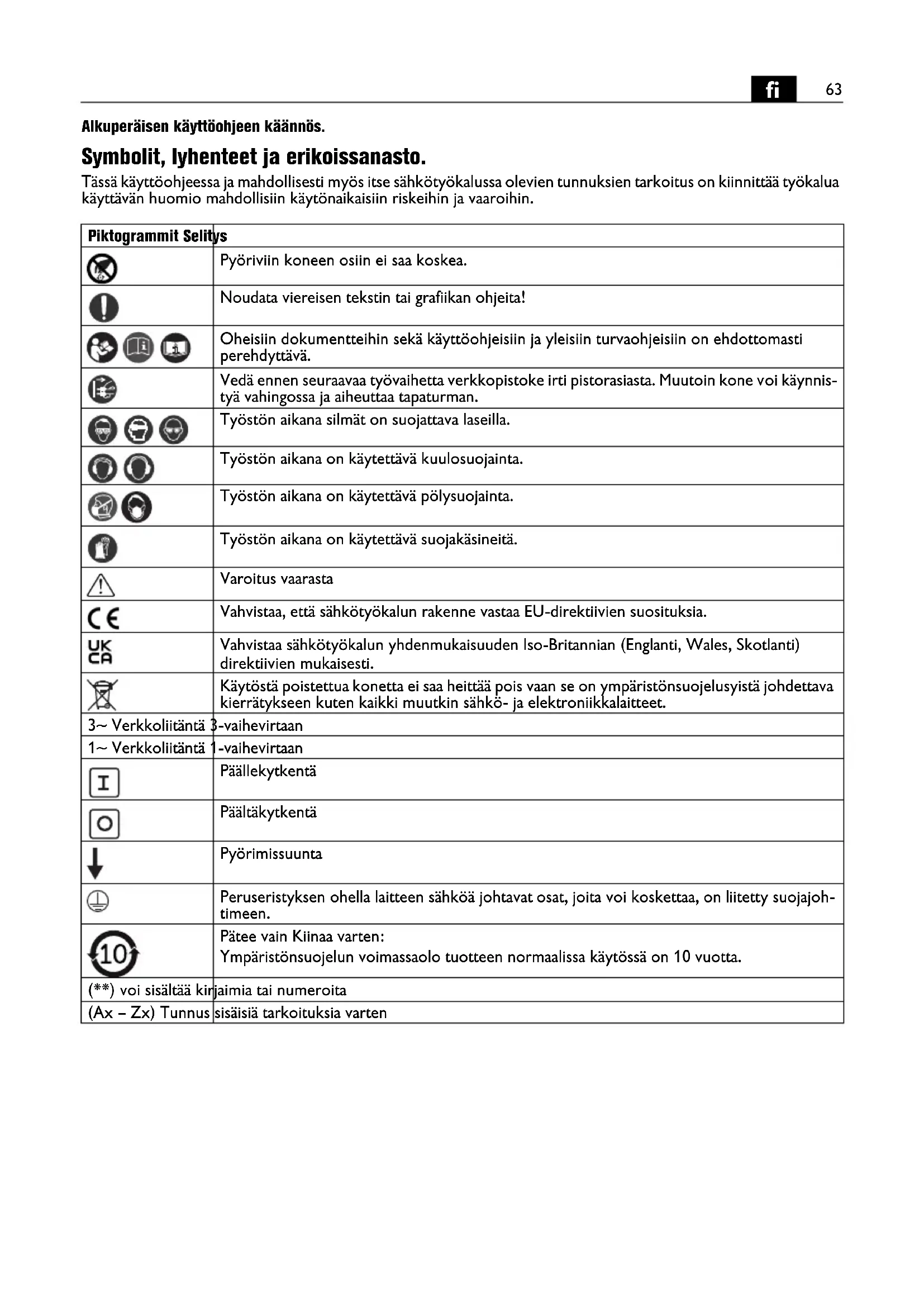 Alkuperäisen käyttöohjeen käännös. Symbolit, lyhenteet ja erikoissanasto. Tässä käyttöohjeessa ja mahdollisesti myös itse sähkötyökalussa olevien tunnuksien tarkoitus on kiinnittää työkalua käyttävän huomio mahdollisiin käytönaikaisiin riskeihin ja vaaroihin. Piktogrammit Selitys Pyöriviin koneen osiin ei saa koskea. Noudata viereisen tekstin tai grafiikan ohjeita! Oheisiin dokumentteihin sekä käyttöohjeisiin ja yleisiin turvaohjeisiin on ehdottomasti perehdyttävä. Vedä ennen seuraavaa työvaihetta verkkopistoke irti pistorasiasta. Muutoin kone voi käynnis- tyä vahingossa ja aiheuttaa tapaturman. Työstön aikana silmät on suojattava laseilla. Työstön aikana on käytettävä kuulosuojainta. Työstön aikana on käytettävä pölysuojainta. Työstön aikana on käytettävä suojakäsineitä. Varoitus vaarasta Vahvistaa, että sähkötyökalun rakenne vastaa EU-direktiivien suosituksia. Vahvistaa sähkötyökalun yhdenmukaisuuden Iso-Britannian (Englanti, Wales, Skotlanti) direktiivien mukaisesti. Käytöstä poistettua konetta ei saa heittää pois vaan se on ympäristönsuojelusyistä johdettava kierrätykseen kuten kaikki muutkin sähkö- ja elektroniikkalaitteet. 3~ Verkkoliitäntä 3-vaihevirtaan 1~ Verkkoliitäntä 1-vaihevirtaan Päällekytkentä Päältäkytkentä Pyörimissuunta Peruseristyksen ohella laitteen sähköä johtavat osat, joita voi koskettaa, on liitetty suojajoh- timeen. Pätee vain Kiinaa varten: Ympäristönsuojelun voimassaolo tuotteen normaalissa käytössä on 10 vuotta. (**) voi sisältää kirjaimia tai numeroita (Ax – Zx) Tunnus sisäisiä tarkoituksia varten64